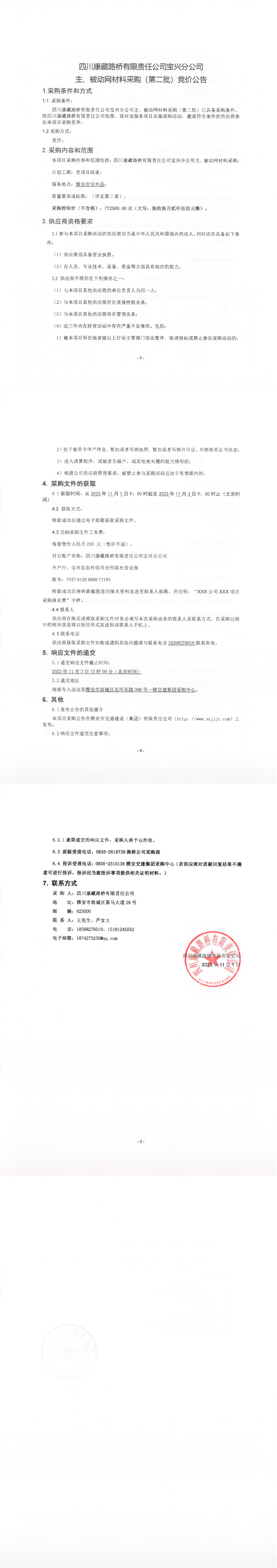 四川康藏路橋有限責(zé)任公司寶興分公司主、被動網(wǎng)材料采購(第二批)競價(jià)公告