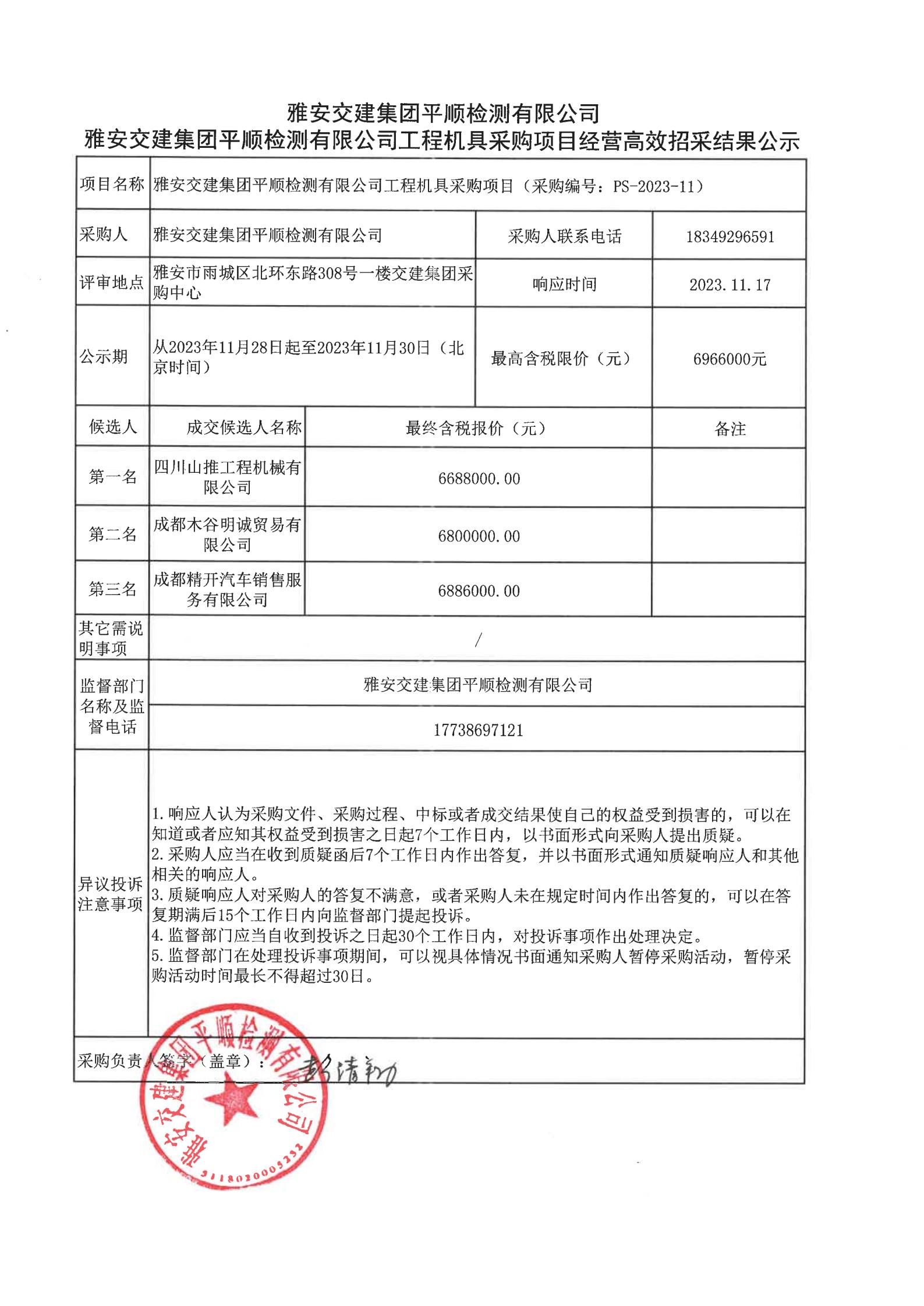 雅安交建集團(tuán)平順檢測有限公司工程機(jī)具采購項(xiàng)目經(jīng)營高效招采結(jié)果公示