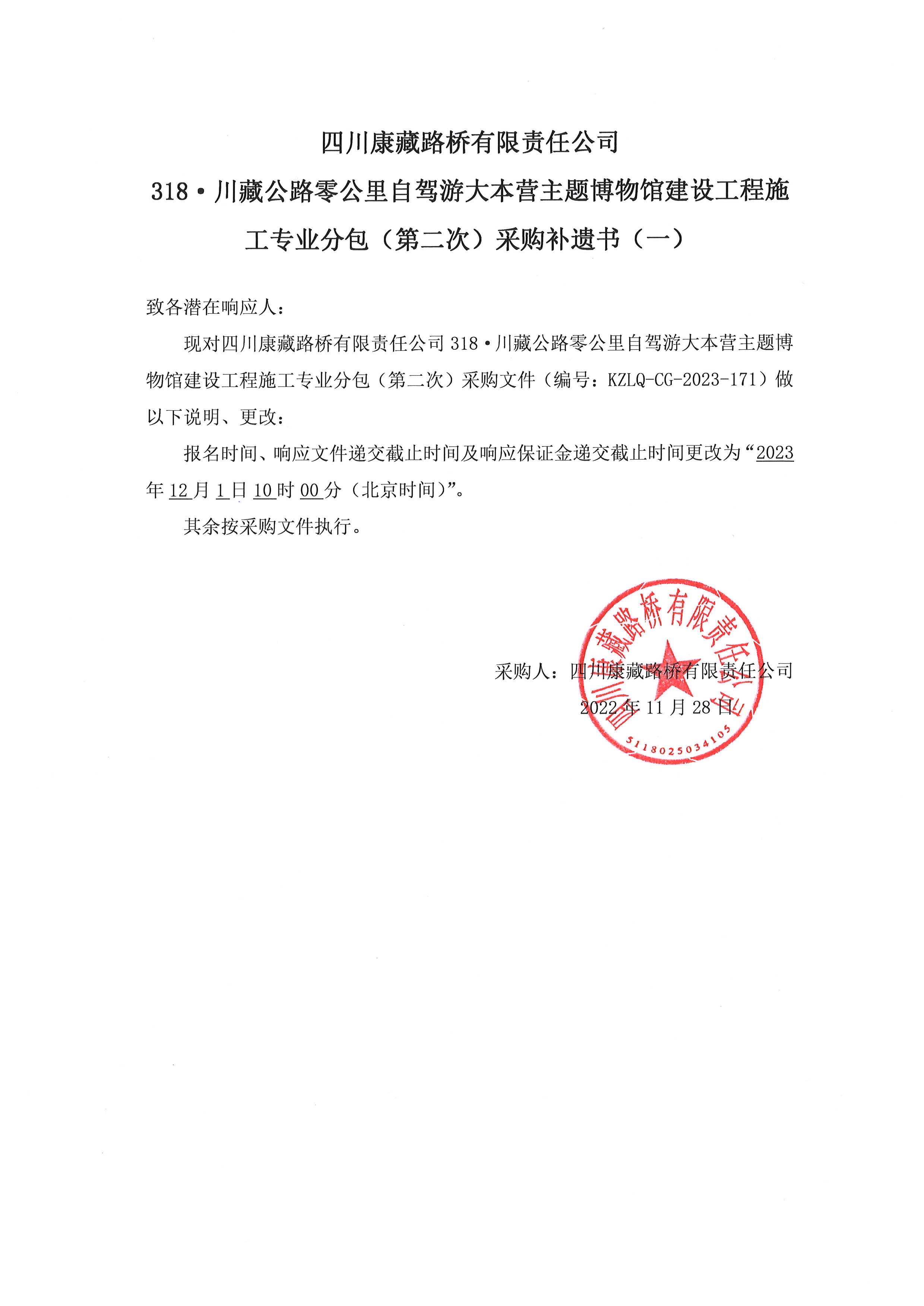 四川康藏路橋有限責任公司318·川藏公路零公里自駕游大本營主題博物館建設(shè)工程施工專業(yè)分包(第二次)采購補遺書(一)