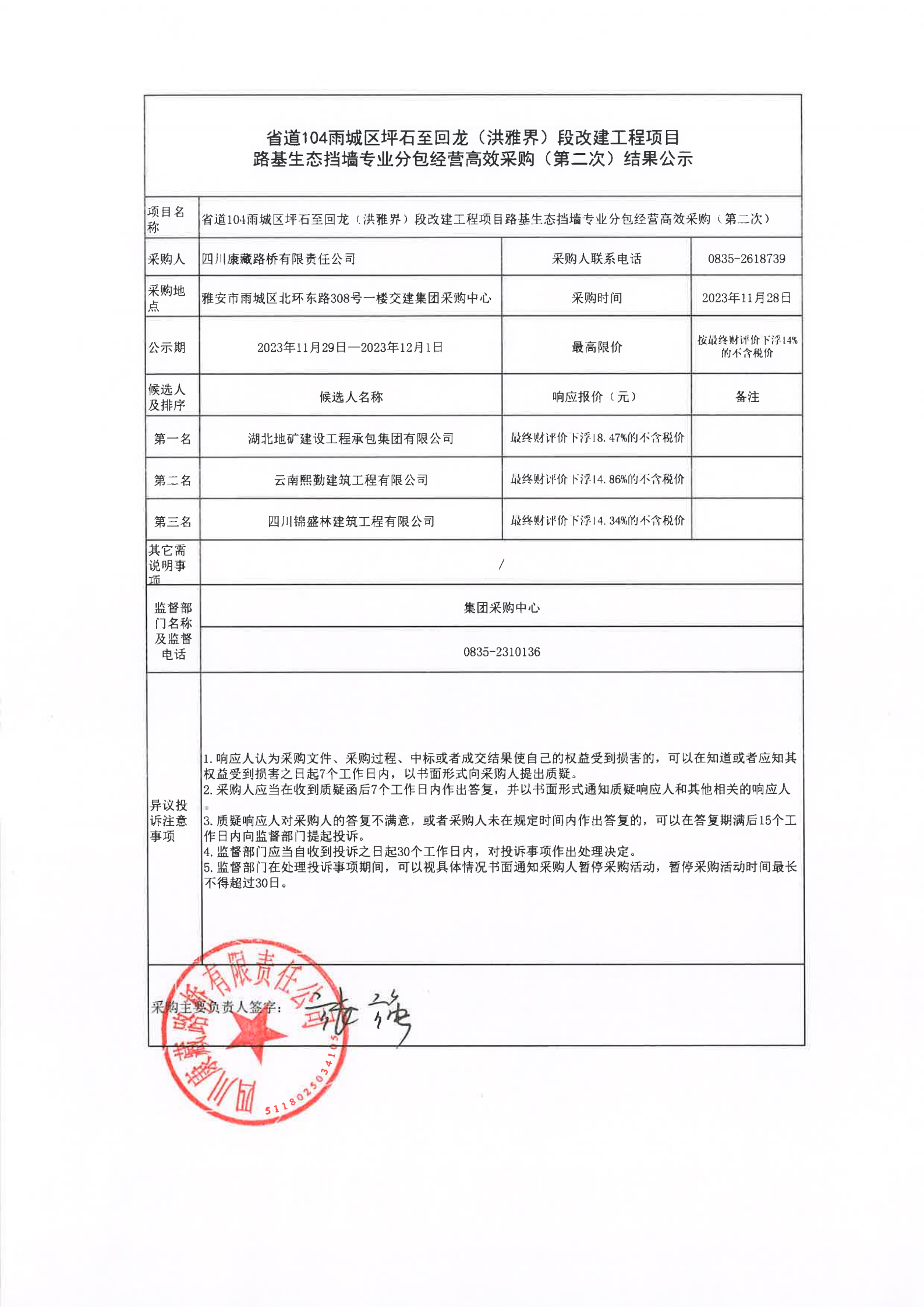 四川康藏路橋有限責(zé)任公司省道104雨城區(qū)坪石至回龍(洪雅界)段改建工程項(xiàng)目路基生態(tài)擋墻專業(yè)分包經(jīng)營(yíng)高效采購(gòu)(第二次)結(jié)果公示
