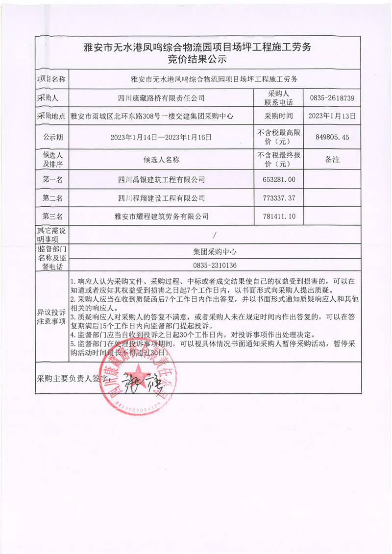 四川康藏路橋有限責(zé)任公司雅安市無(wú)水港鳳鳴綜合物流園項(xiàng)目場(chǎng)坪工程施工勞務(wù)競(jìng)價(jià)結(jié)果公示