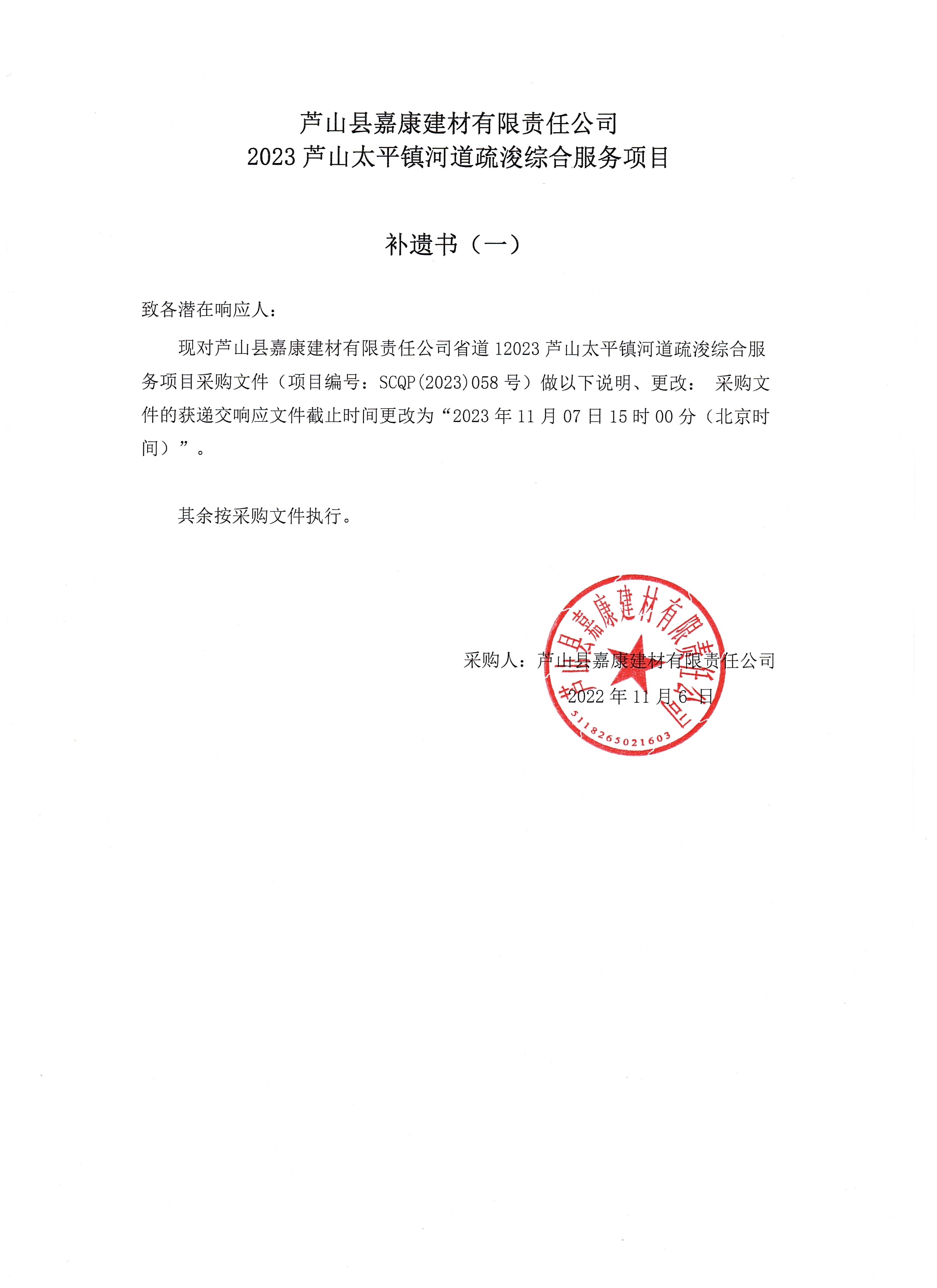 蘆山縣嘉康嘉康建材有限責(zé)任公司2023蘆山太平鎮(zhèn)河道疏浚綜合服務(wù)項目補遺書(一)