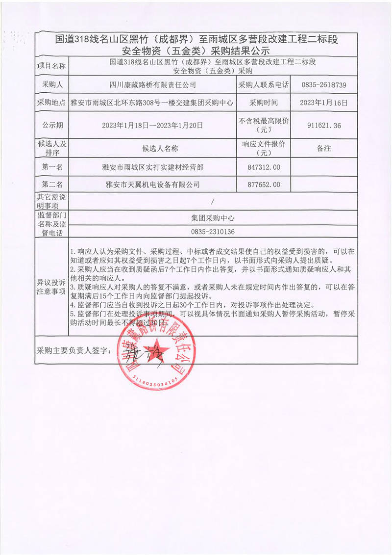 四川康藏路橋有限責(zé)任公司國(guó)道318線名山區(qū)黑竹(成都界)至雨城區(qū)多營(yíng)段改建工程二標(biāo)段安全物資(五金類)采購(gòu)結(jié)果公示