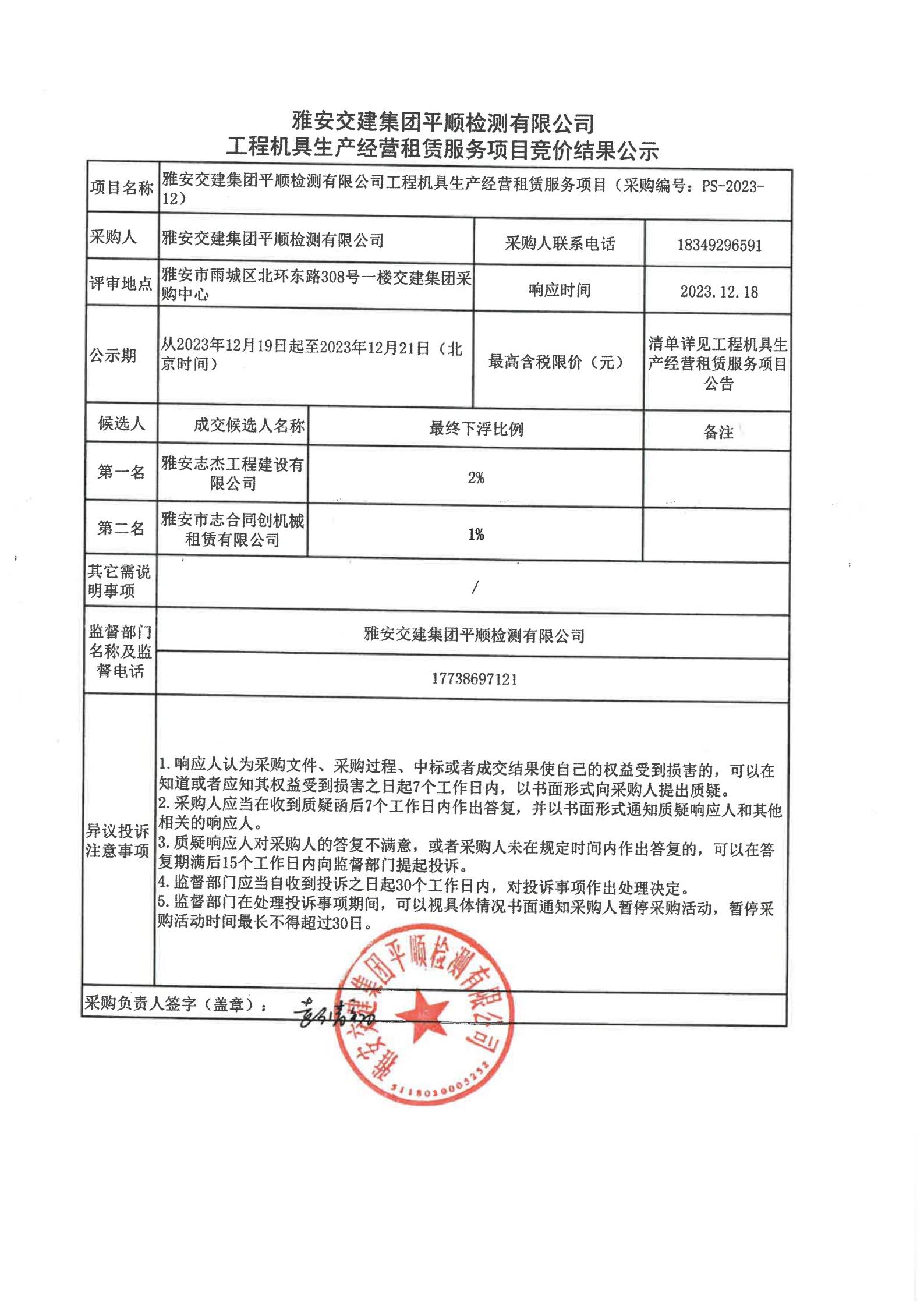 雅安交建集團(tuán)平順檢測(cè)有限公司工程機(jī)具生產(chǎn)經(jīng)營(yíng)租賃服務(wù)項(xiàng)目競(jìng)價(jià)結(jié)果公示