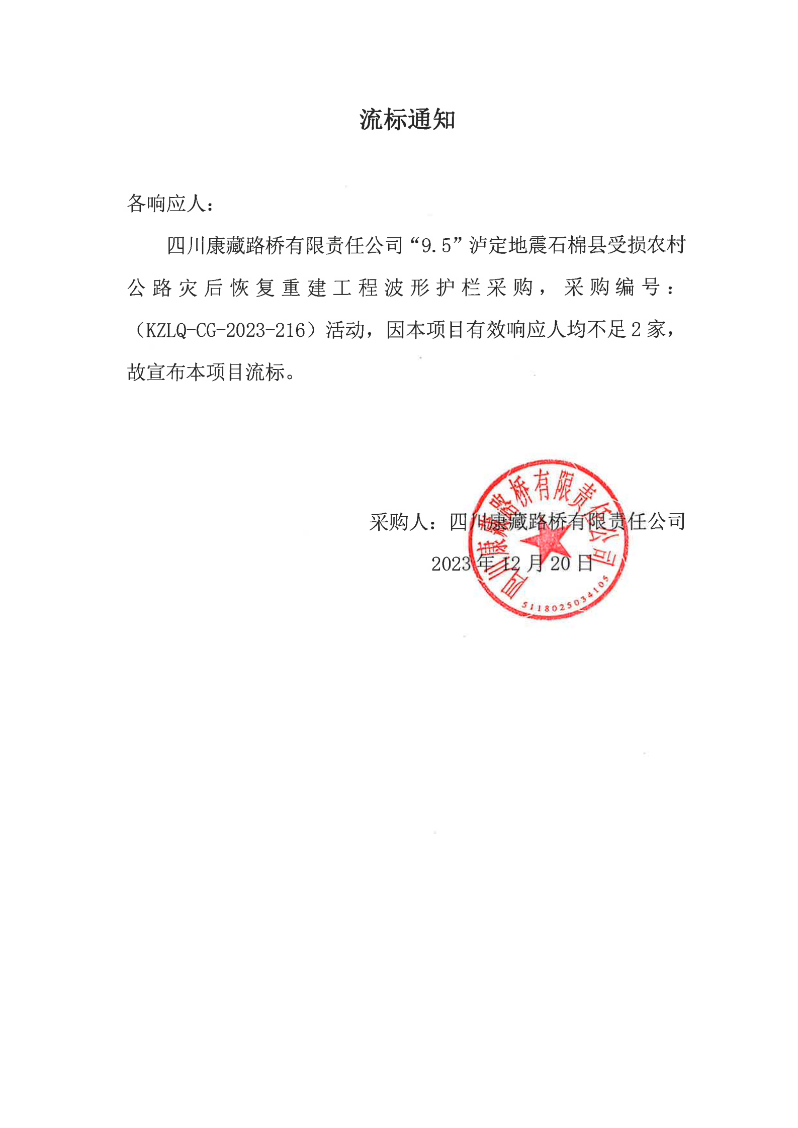 四川康藏路橋有限責(zé)任公司“9.5”瀘定地震石棉縣受損農(nóng)村公路災(zāi)后恢復(fù)重建工程波形護(hù)欄采購流標(biāo)通知