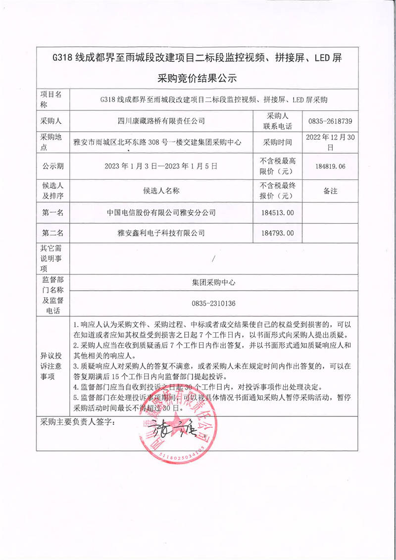 四川康藏路橋有限責(zé)任公司G318線成都界至雨城段改建項目二標(biāo)段監(jiān)控視頻、拼接屏、LED屏采購競價結(jié)果公示