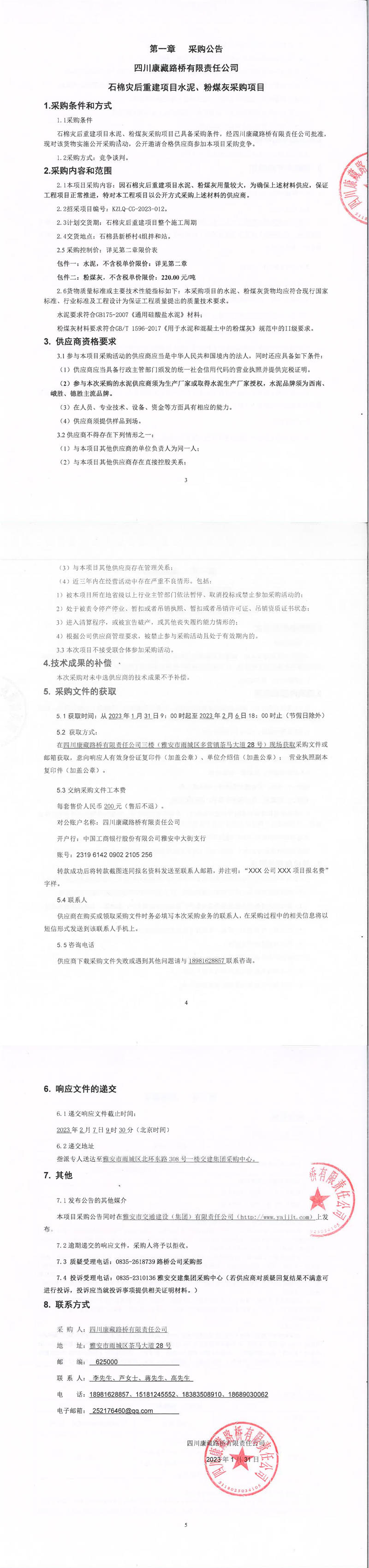 四川康藏路橋有限責(zé)任公司石棉災(zāi)后重建項目水泥、粉煤灰采購項目采購公告