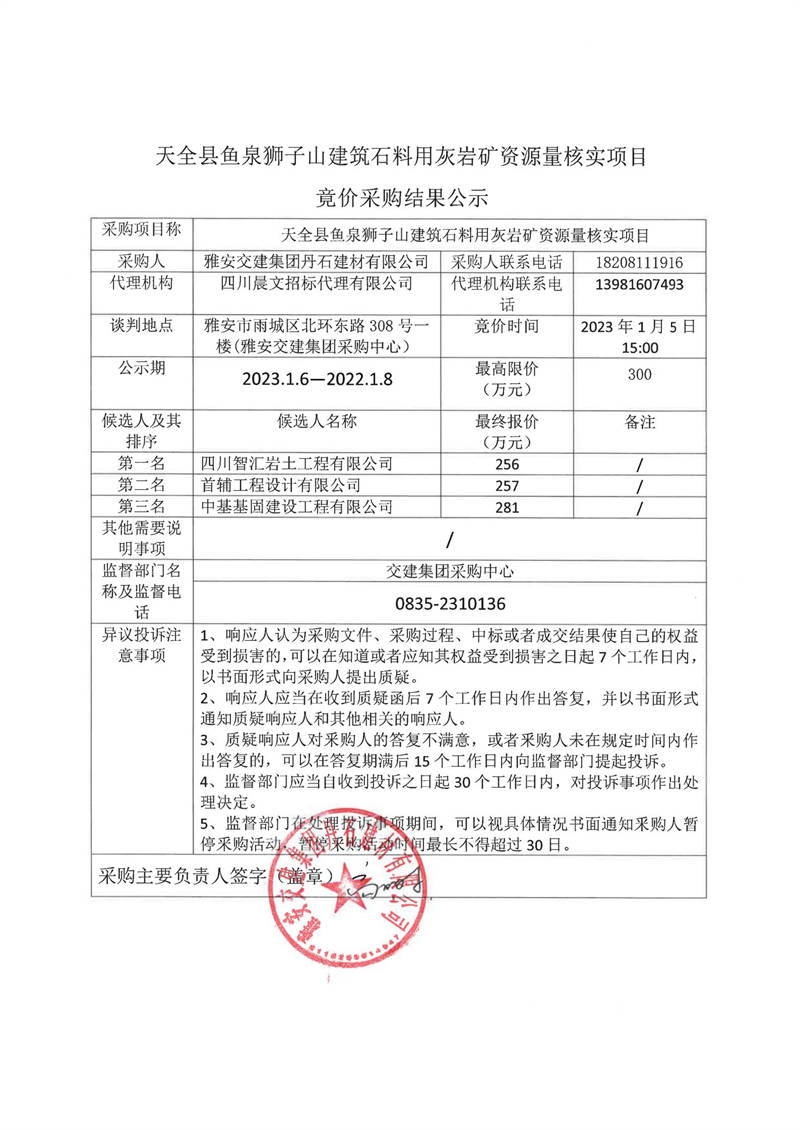 雅安交建集團(tuán)丹石建材有限公司天全縣魚泉獅子山建筑石料用灰?guī)r礦資源量核實(shí)項(xiàng)目競價采購結(jié)果公示