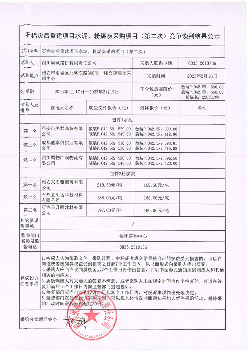 四川康藏路橋有限責任公司石棉災后重建項目水泥、粉煤灰采購項目(第二次)競爭談判結果公示