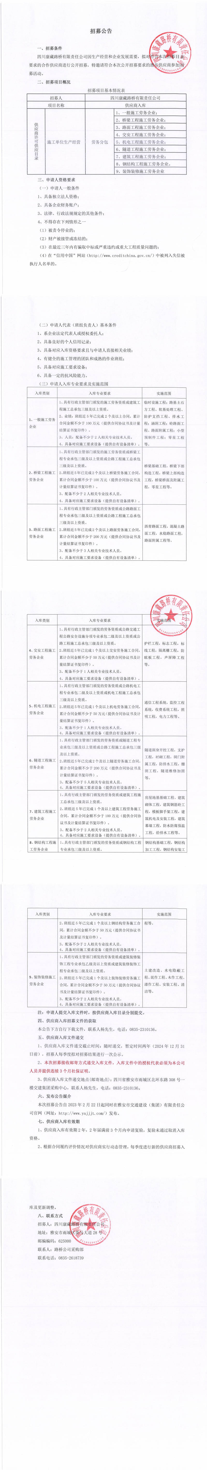 四川康藏路橋有限責任公司2023年供應(yīng)商入庫(施工單位生產(chǎn)經(jīng)營勞務(wù)分包)招募公告
