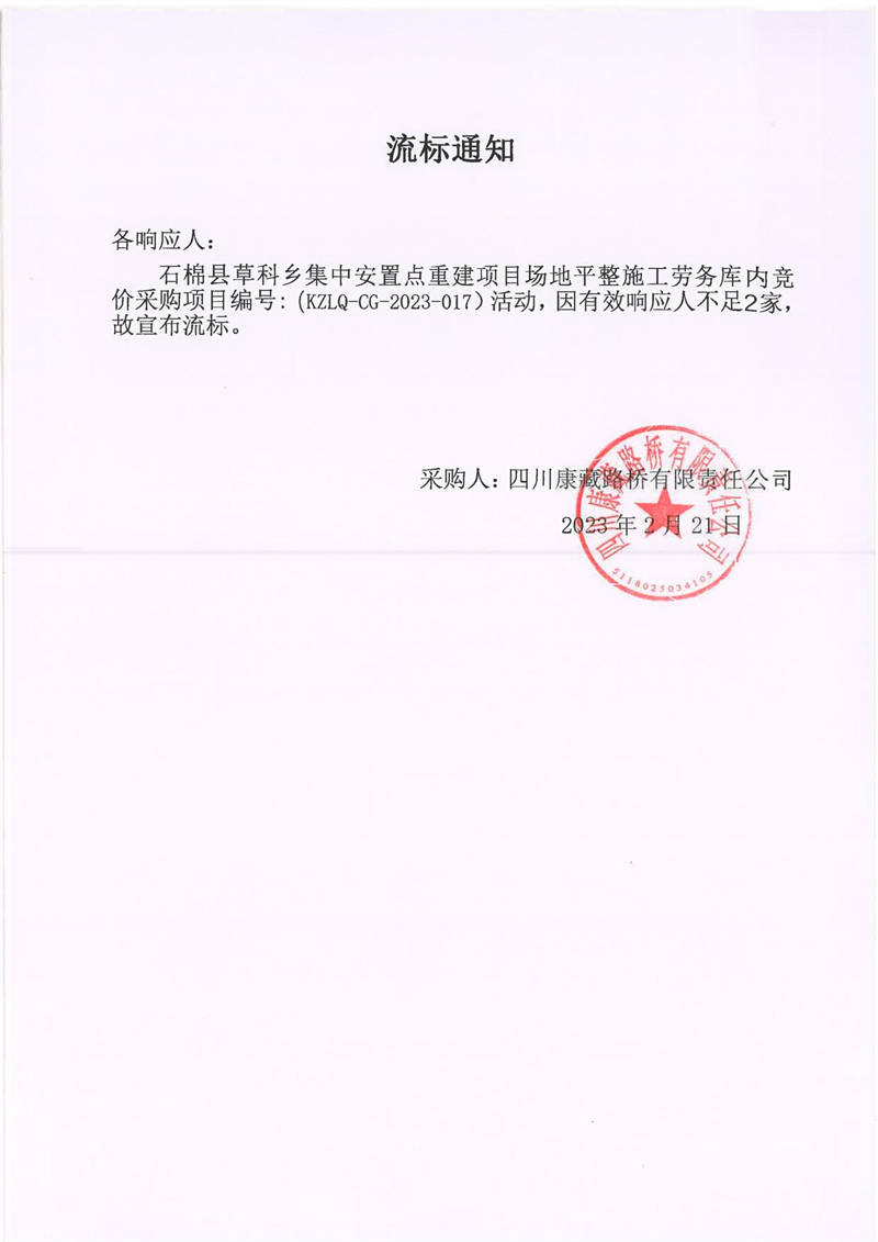 四川康藏路橋有限責(zé)任公司石棉草科鄉(xiāng)集中安置點(diǎn)重建項(xiàng)目場(chǎng)地平整施工勞務(wù)庫(kù)內(nèi)競(jìng)價(jià)流標(biāo)通知