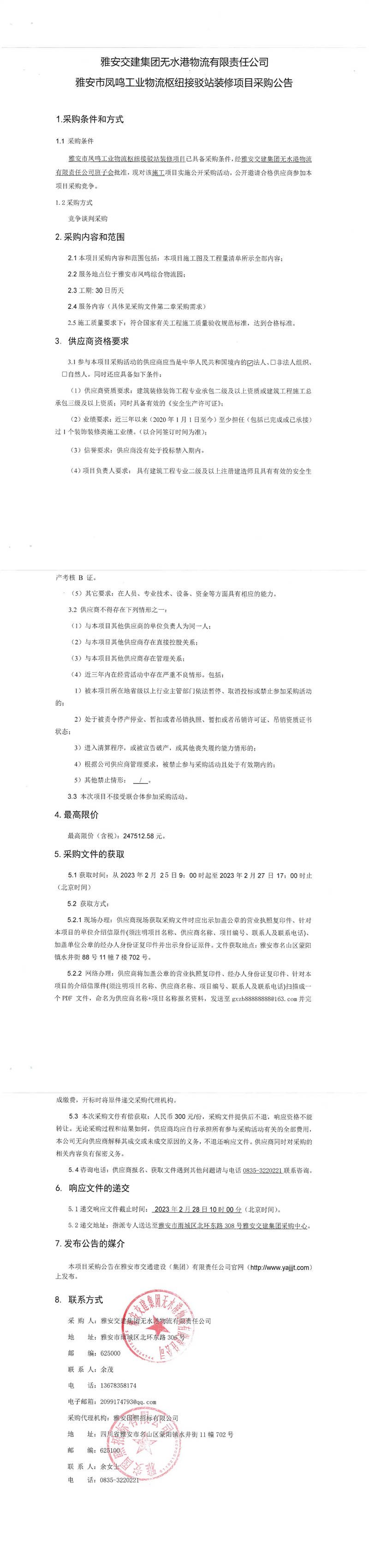 雅安交建集團無水港物流有限責任公司雅安市鳳鳴工業(yè)物流樞紐接駁站裝修項目采購公告