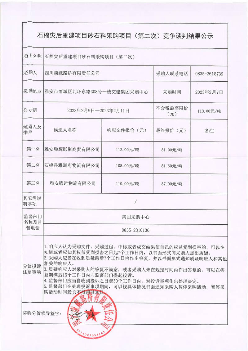 四川康藏路橋有限責(zé)任公司石棉災(zāi)后重建項目砂石料采購項目(第二次)競爭談判結(jié)果公示