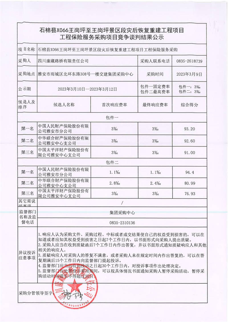 四川康藏路橋有限責(zé)任公司石棉縣X066王崗坪至王崗坪景區(qū)段災(zāi)后恢復(fù)重建工程項(xiàng)目工程保險(xiǎn)服務(wù)采購(gòu)競(jìng)爭(zhēng)談判結(jié)果公示