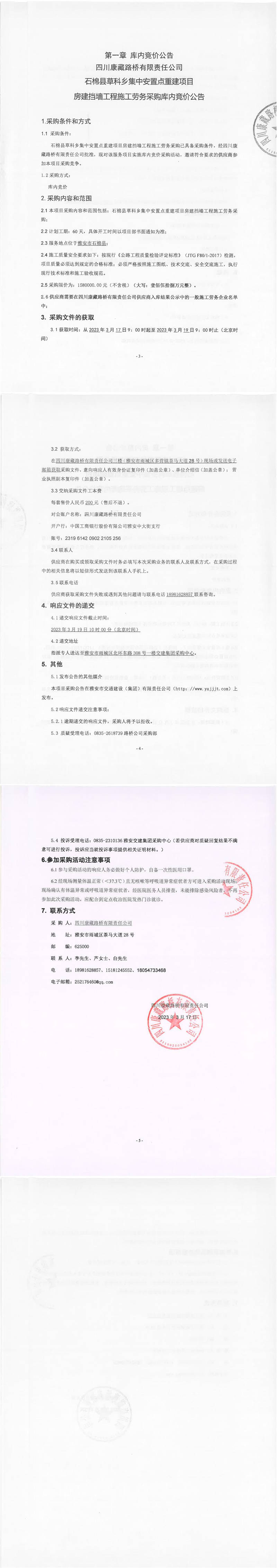 四川康藏路橋有限責任公司石棉草科鄉(xiāng)集中安置點重建項目房建擋墻工程施工勞務采購庫內(nèi)競價公告