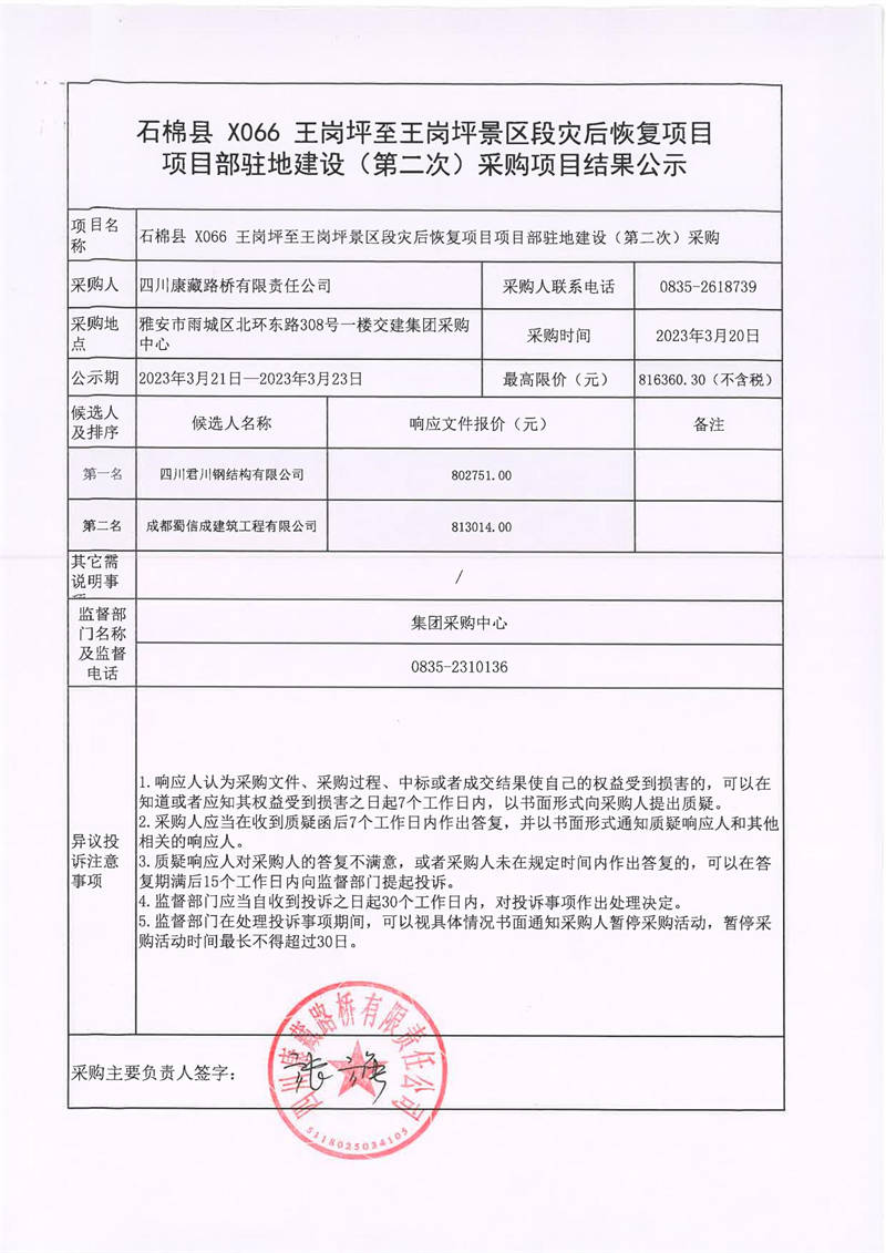 四川康藏路橋有限責任公司石棉縣X066王崗坪至王崗坪景區(qū)段災后恢項目項目駐地建設(第二次)采購結(jié)果公示