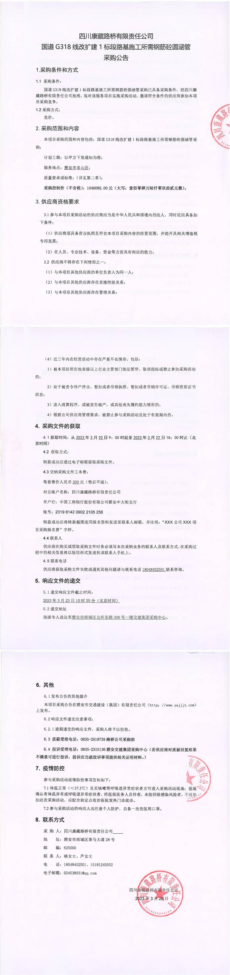 四川康藏路橋有限責(zé)任公司國(guó)道G318線改擴(kuò)建1標(biāo)段路基施工所需鋼筋砼圓涵管采購(gòu)公告