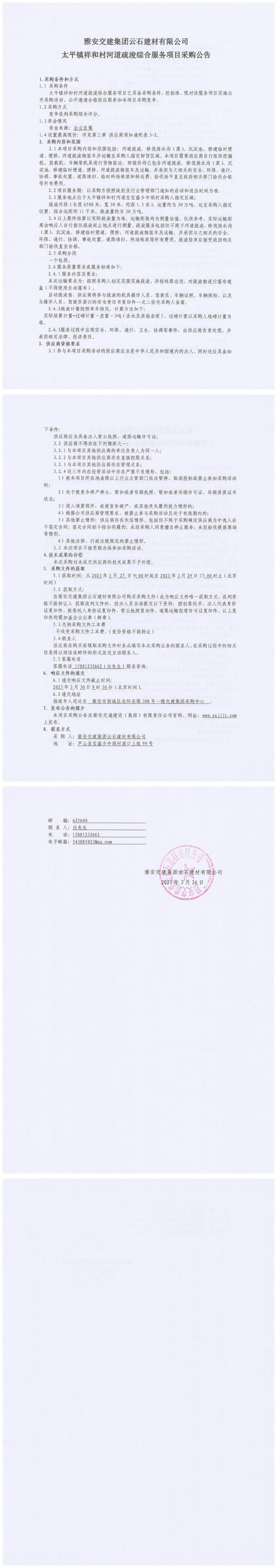 雅安交建集團云石建材有限公司太平鎮(zhèn)祥和村河道疏浚綜合服務(wù)項目采購公告