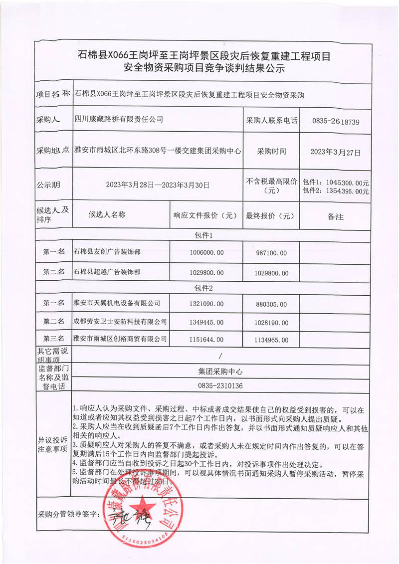 四川康藏路橋有限責任公司石棉縣X066王崗坪至王崗坪景區(qū)段災(zāi)后恢復(fù)重建工程項目安全物資采購項目競爭談判結(jié)果公示