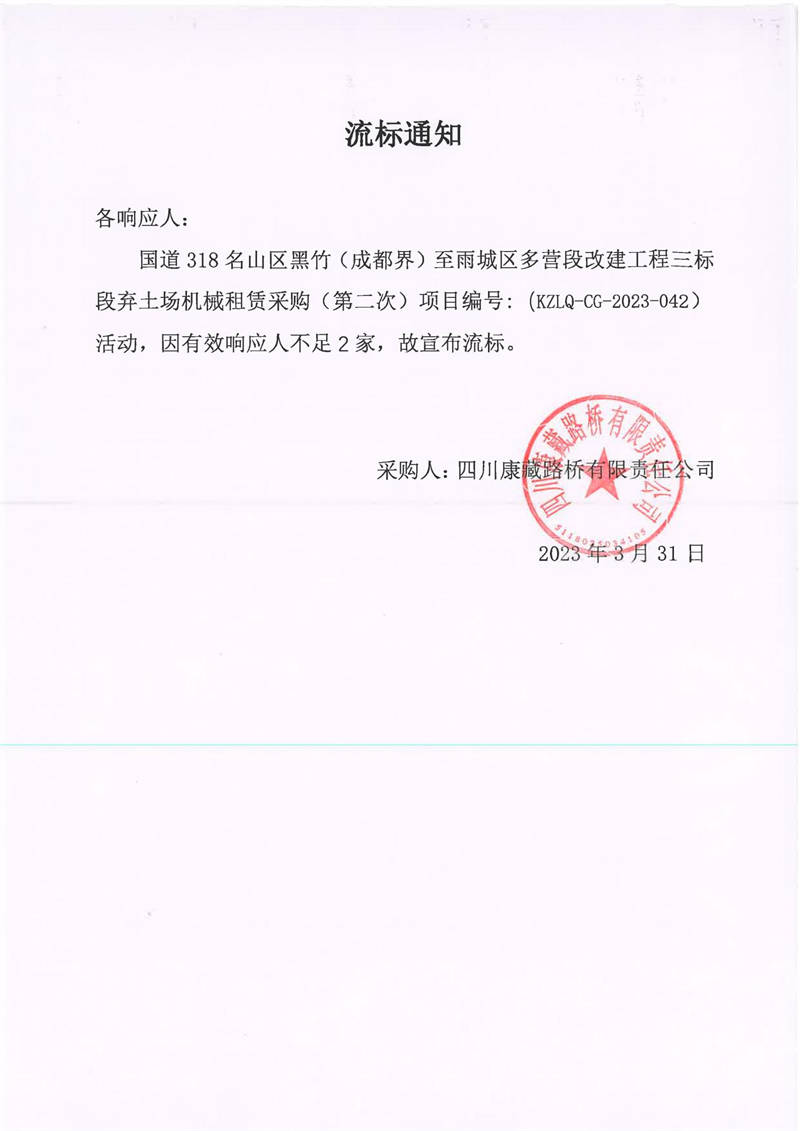 四川康藏路橋有限責(zé)任公司國道318名山區(qū)黑竹(成都界)至雨城區(qū)多營段改建工程三標(biāo)段棄土場(chǎng)機(jī)械租賃采購流標(biāo)通知