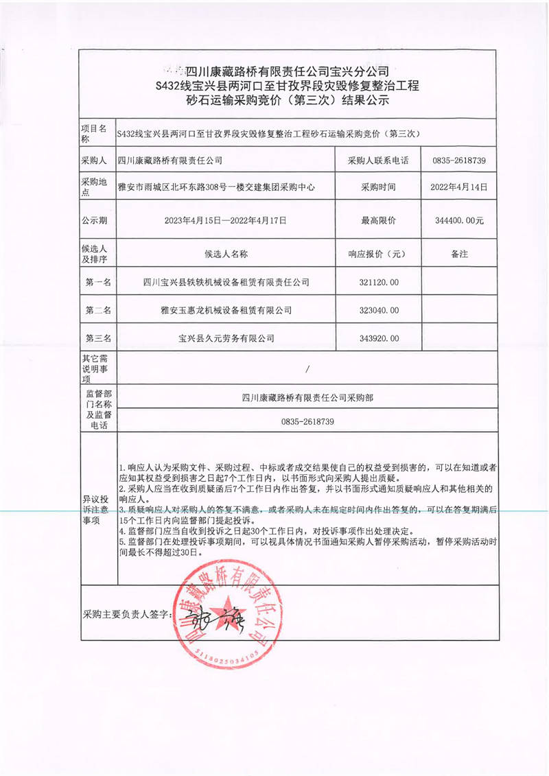 四川康藏路橋有限責(zé)任公司寶興分公司S432線寶興縣兩河口至甘孜界段災(zāi)毀修復(fù)整治工程砂石運(yùn)輸采購競(jìng)價(jià)(第三次)結(jié)果公示