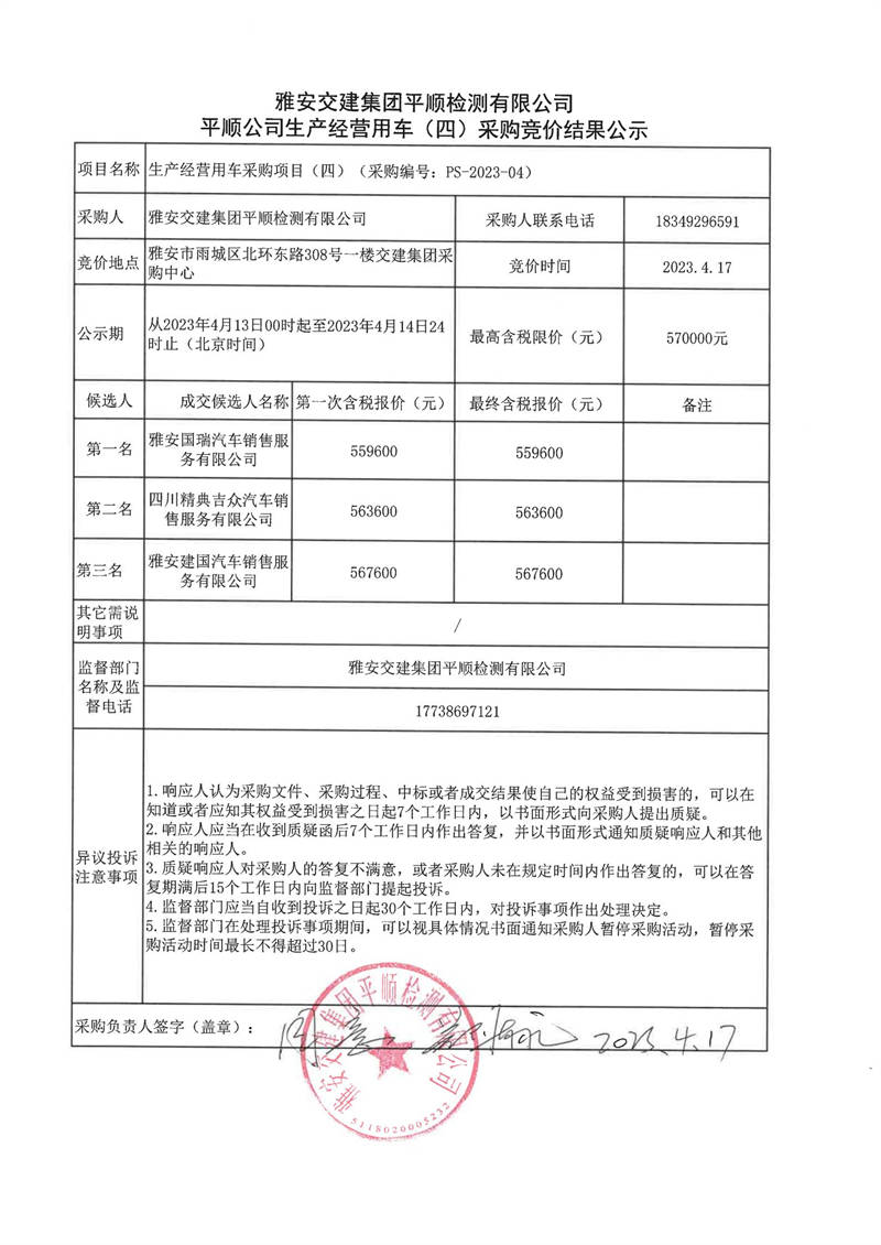 雅安交建集團(tuán)平順檢測(cè)有限公司平順公司生產(chǎn)經(jīng)營(yíng)用車(四)采購(gòu)競(jìng)價(jià)結(jié)果公示