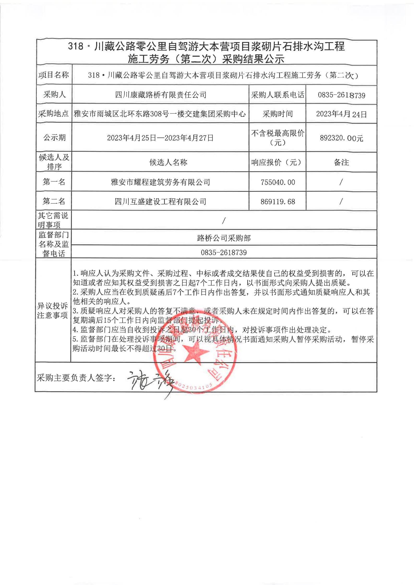 四川康藏路橋有限責任公司318·川藏公路零公里自駕游大本營項目漿砌片石排水溝工程施工勞務(wù)(第二次)采購結(jié)果公示