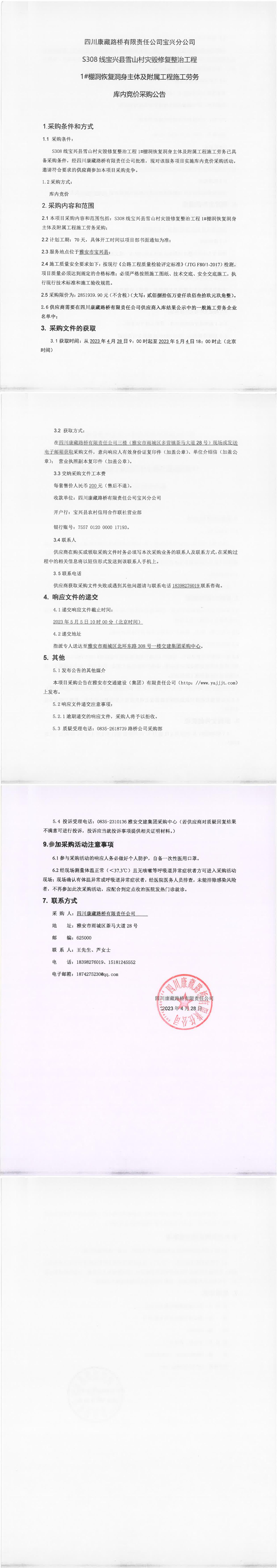 四川康藏路橋有限責(zé)任公司寶興分公司S308線寶興縣雪山村段災(zāi)毀修復(fù)整治工程1#棚洞恢復(fù)洞身主體及附屬工程施工勞務(wù)庫(kù)內(nèi)競(jìng)價(jià)采購(gòu)公告