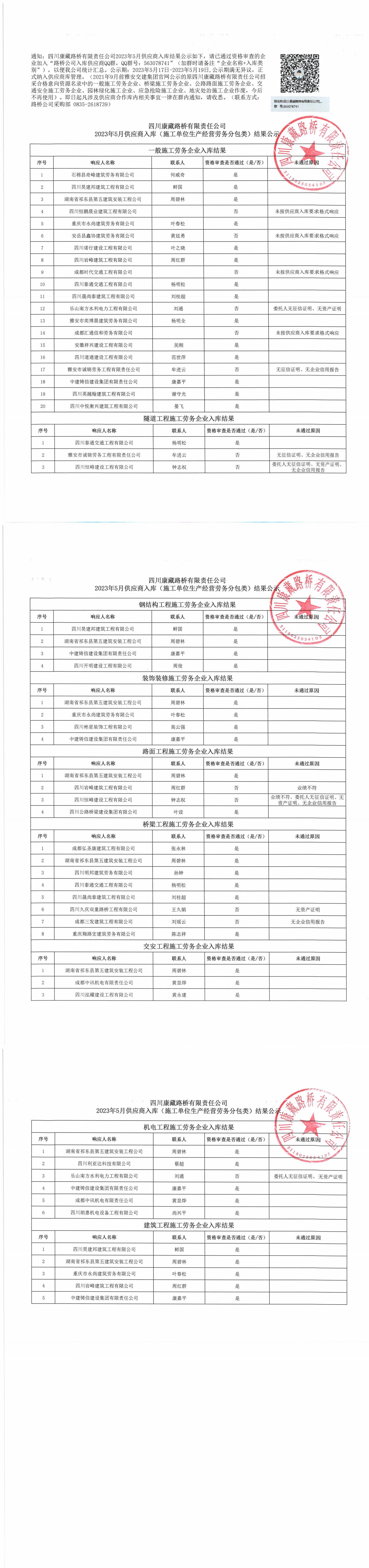 四川康藏路橋有限責任公司2023年5月供應商入庫(施工單位生產(chǎn)經(jīng)營勞務分包類)結果公示