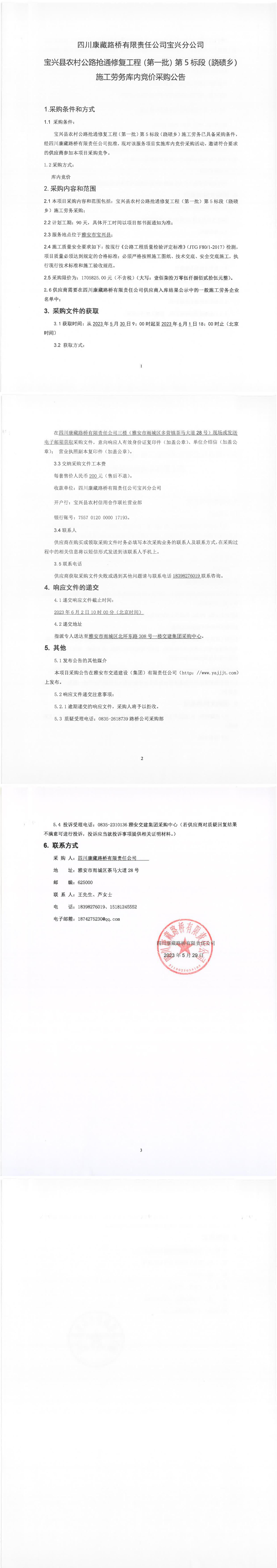四川康藏路橋有限責任公司寶興農(nóng)村公路搶通修復工程(第一批)第5標段(蹺磧鄉(xiāng))施工勞務(wù)庫內(nèi)競價采購公告