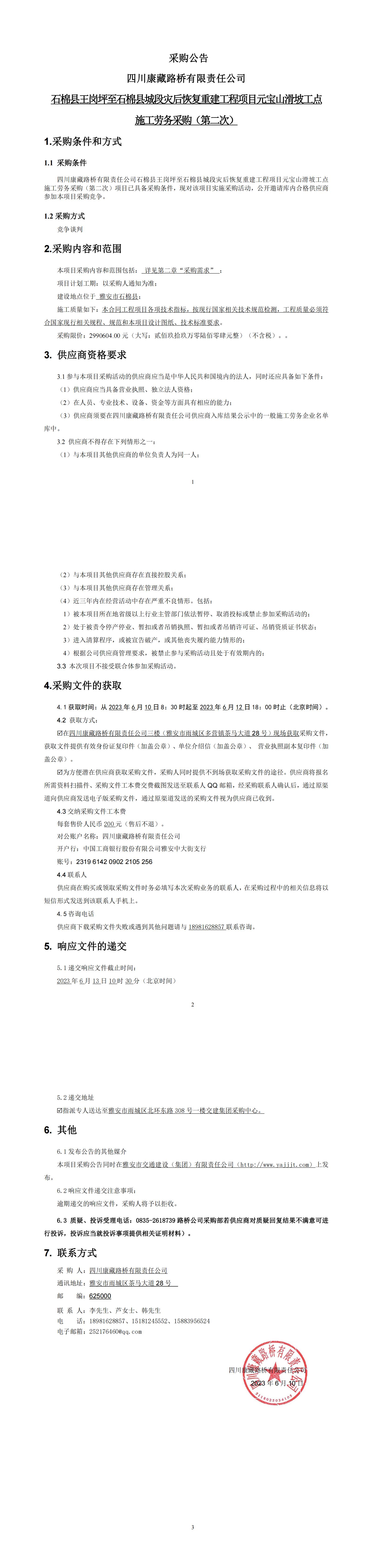 四川康藏路橋有限責(zé)任公司石棉縣王崗坪至石棉縣城段災(zāi)后恢復(fù)重建工程項(xiàng)目元寶山滑坡工點(diǎn)施工勞務(wù)采購(gòu)(第二次)