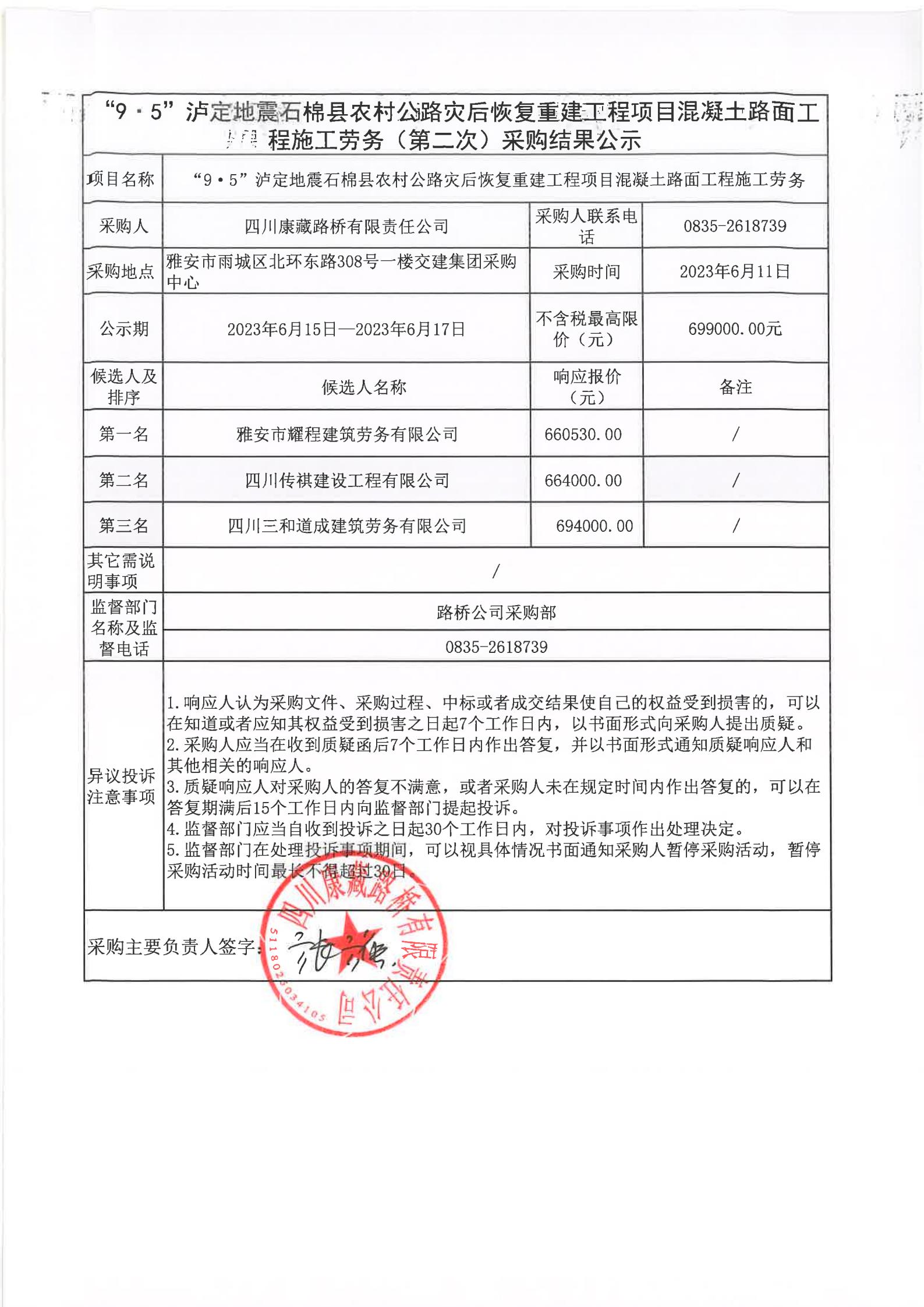 四川康藏路橋有限責任公司“9·5”瀘定地震石棉縣農(nóng)村公路災(zāi)后恢復(fù)重建工程項目混凝土路面工程施工勞務(wù)采購(第二次)結(jié)果公示