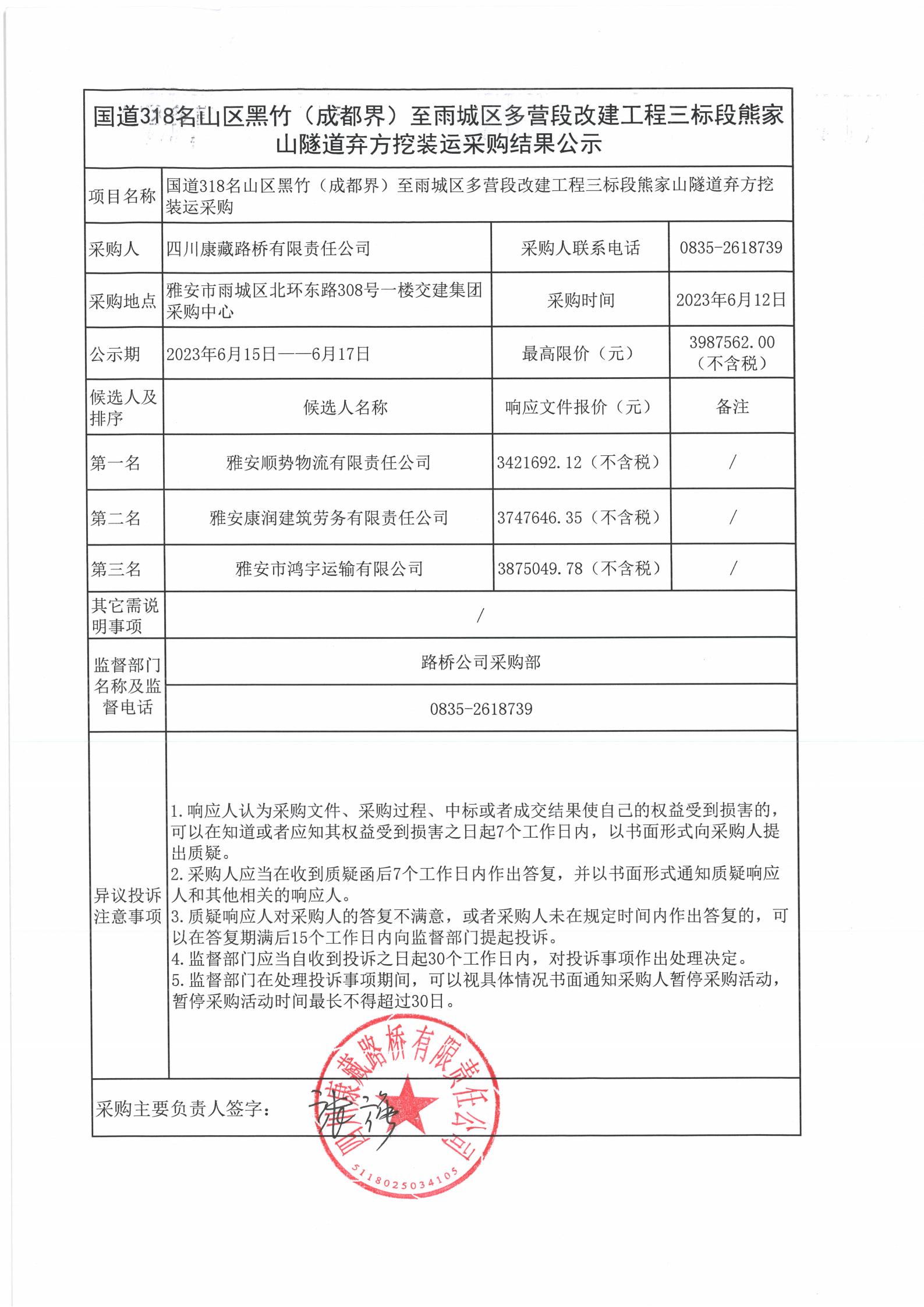 四川康藏路橋有限責(zé)任公司國道318名山區(qū)黑竹(成都界)至雨城區(qū)多營段改建工程三標(biāo)段熊家山隧道棄方挖裝運(yùn)采購結(jié)果公示