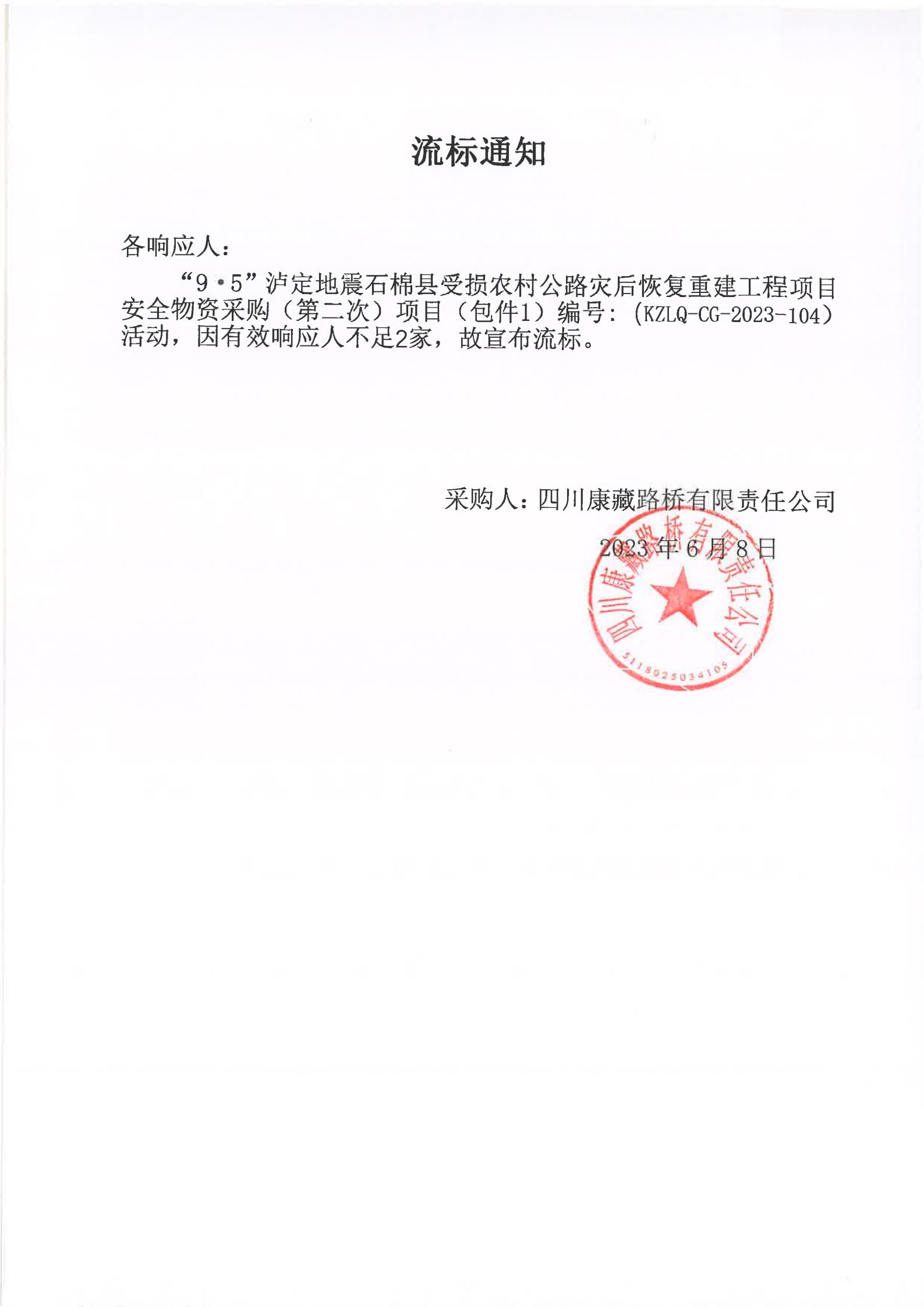四川康藏路橋有限責(zé)任公司“9·5”瀘定地震石棉縣受損農(nóng)村公路災(zāi)后恢復(fù)重建工程項(xiàng)目安全物資競價(jià)采購(第二次)流標(biāo)通知