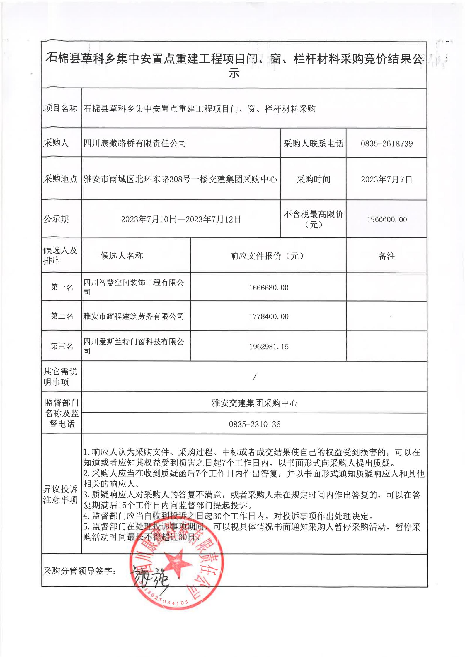 四川康藏路橋有限責(zé)任公司石棉草科鄉(xiāng)集中安置點(diǎn)重建工程項(xiàng)目門、窗、欄桿材料采購競價結(jié)果公示