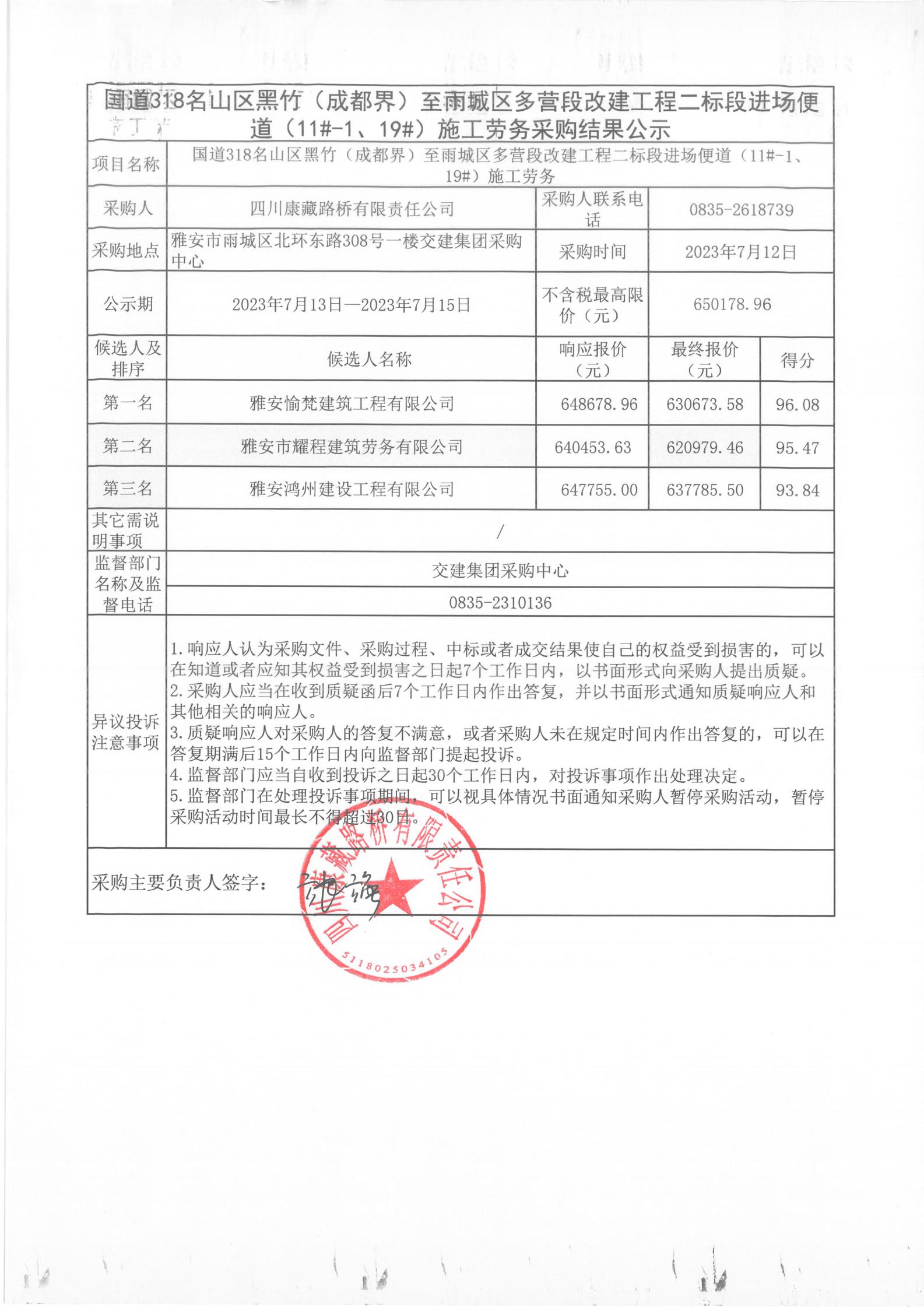 四川康藏路橋有限責(zé)任公司國(guó)道318名山區(qū)黑竹(成都界)至雨城區(qū)多營(yíng)段改建工程二標(biāo)段進(jìn)場(chǎng)便道(11#-1、19#)施工勞務(wù)采購(gòu)結(jié)果公示