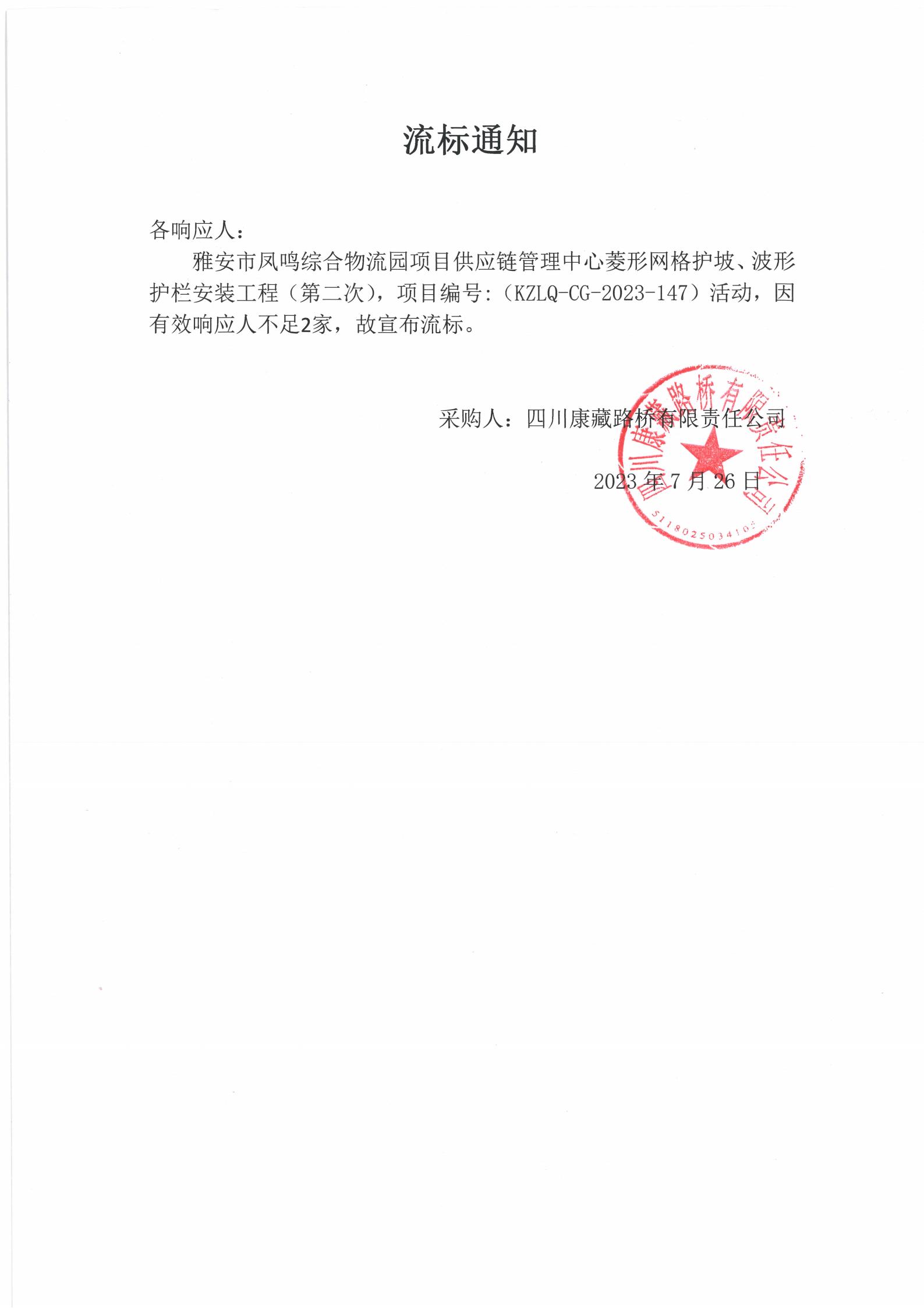 四川康藏路橋有限責(zé)任公司雅安市鳳鳴綜合物流園項(xiàng)目供應(yīng)鏈管理中心菱形網(wǎng)格護(hù)坡、波形護(hù)欄安裝工程(第二次)流標(biāo)通知
