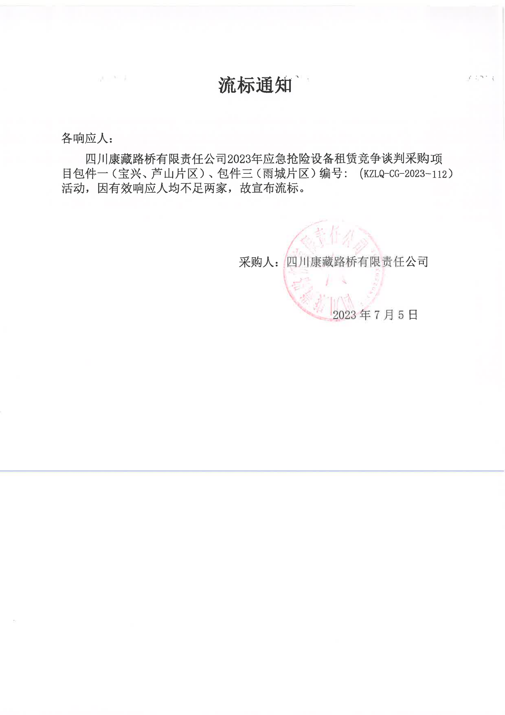 四川康藏路橋有限責(zé)任公司2023年應(yīng)急搶險(xiǎn)設(shè)備租賃競(jìng)爭(zhēng)談判采購項(xiàng)目包件一(寶興、蘆山片區(qū))、包件三(雨城片區(qū))流標(biāo)通知
