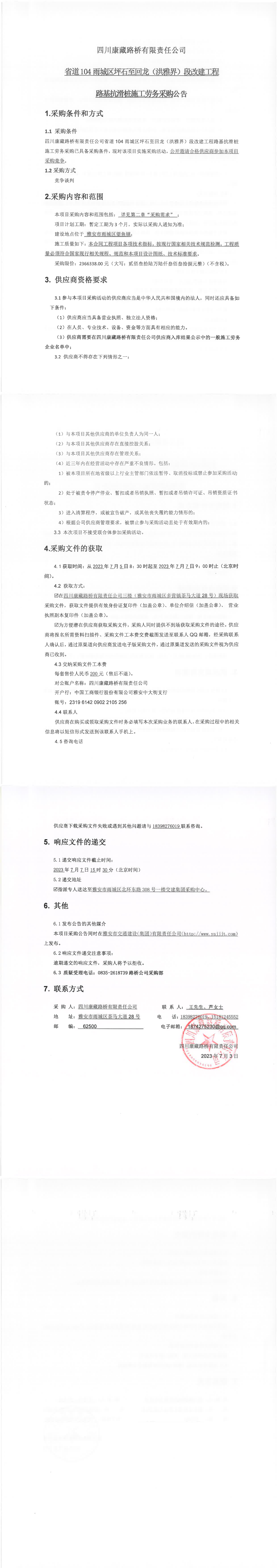 四川康藏路橋有限責任公司省道104雨城區(qū)坪石至回龍(洪雅界)段改建工程路基抗滑樁施工勞務(wù)采購公告