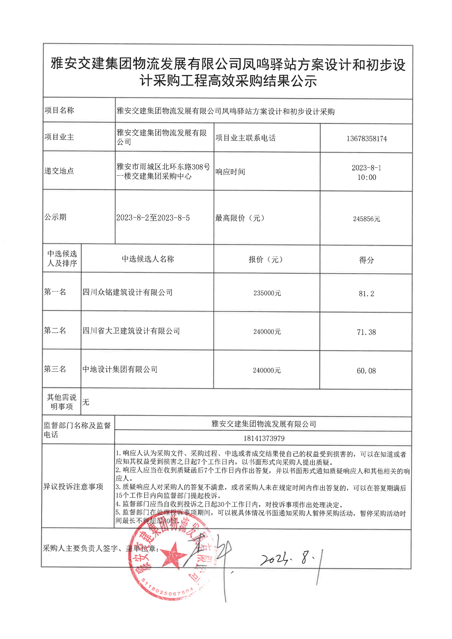 雅安交建集團(tuán)物流發(fā)展有限公司鳳鳴驛站方案設(shè)計和初步設(shè)計采購工程高效采購結(jié)果公示
