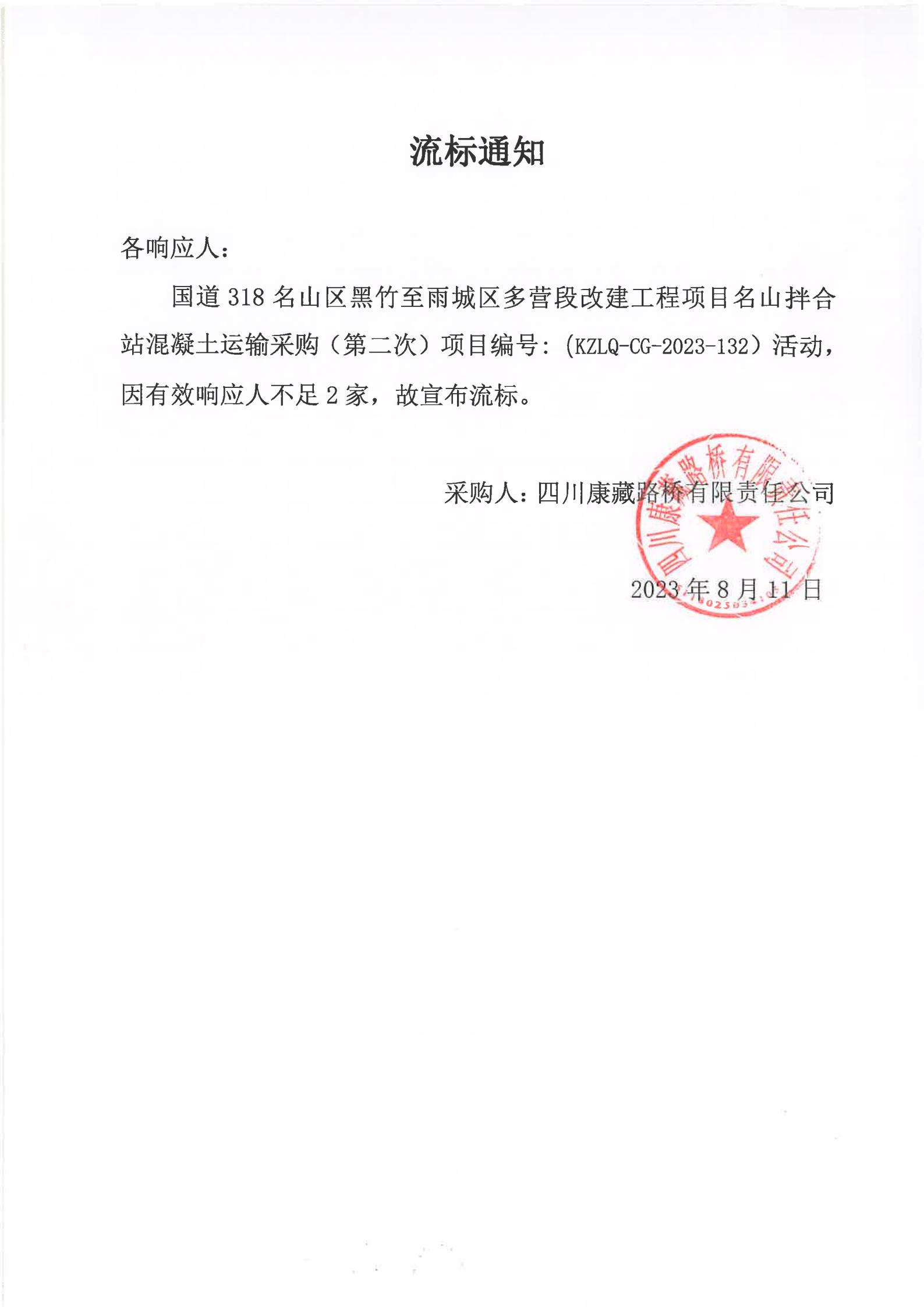 四川康藏路橋有限責任公司國道318名山區(qū)黑竹至雨城區(qū)多營段改建工程項目名山拌合站混凝土運輸服務(wù)(第二次)流標通知)