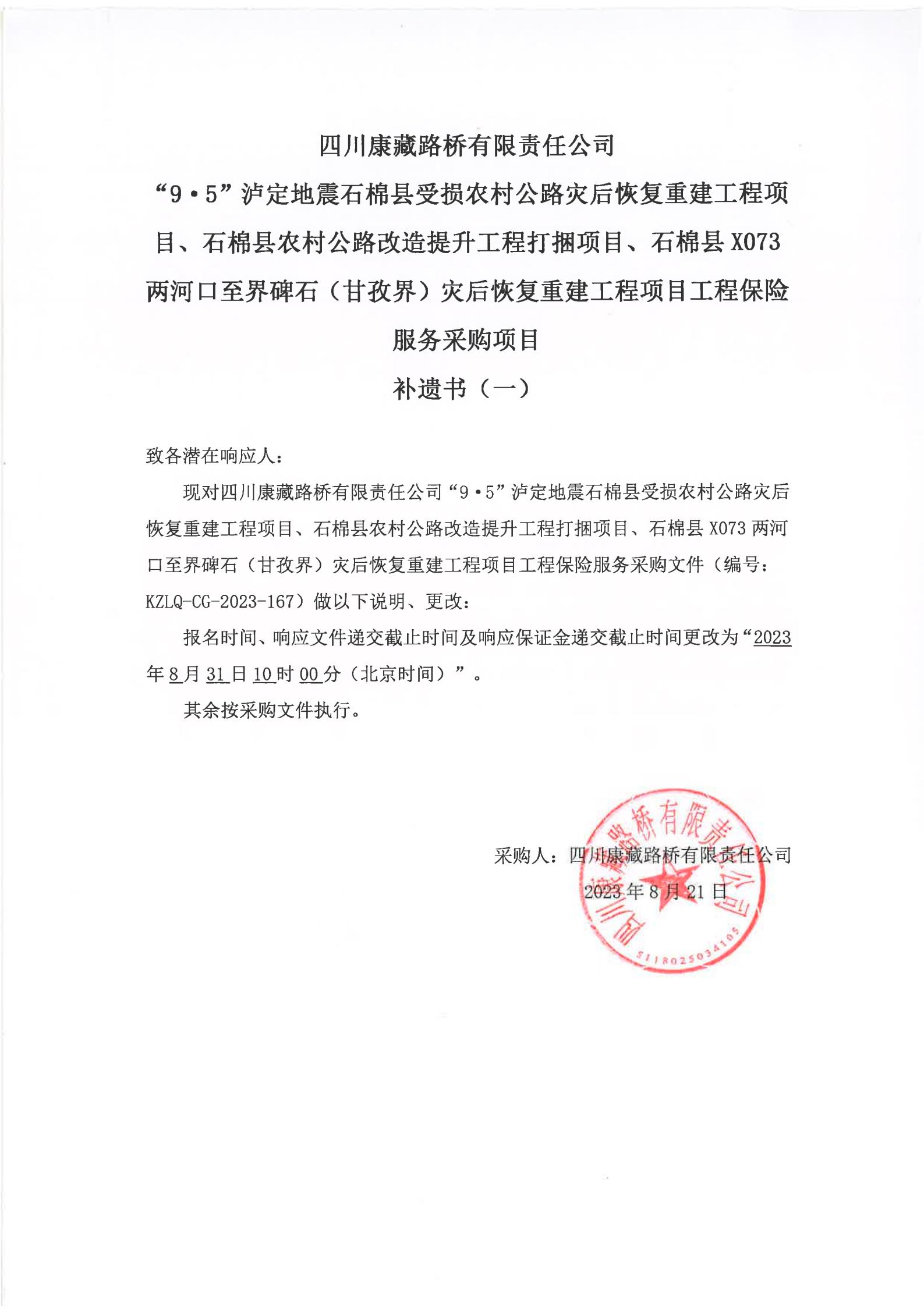 四川康藏路橋有限責(zé)任公司“9·5”瀘定地震石棉縣受損農(nóng)村公路災(zāi)后恢復(fù)重建工程項目、石棉縣農(nóng)村公路改造提升工程打捆項目、石棉縣X073兩河口至界碑石(甘孜界)災(zāi)后恢復(fù)重建工程項目工程保險服務(wù)采購項目補遺書(一)