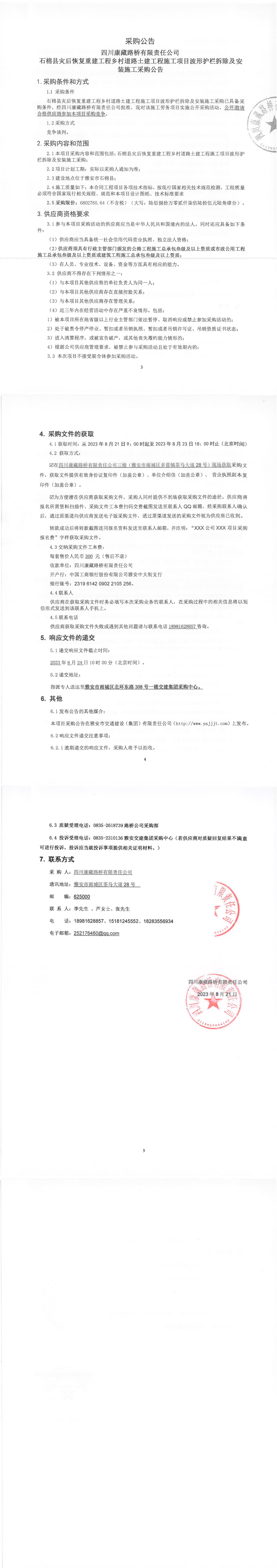 四川康藏路橋有限責(zé)任公司石棉縣災(zāi)后恢復(fù)重建工程鄉(xiāng)村道路土建工程施工項(xiàng)目波形護(hù)欄拆除及安裝施工采購公告