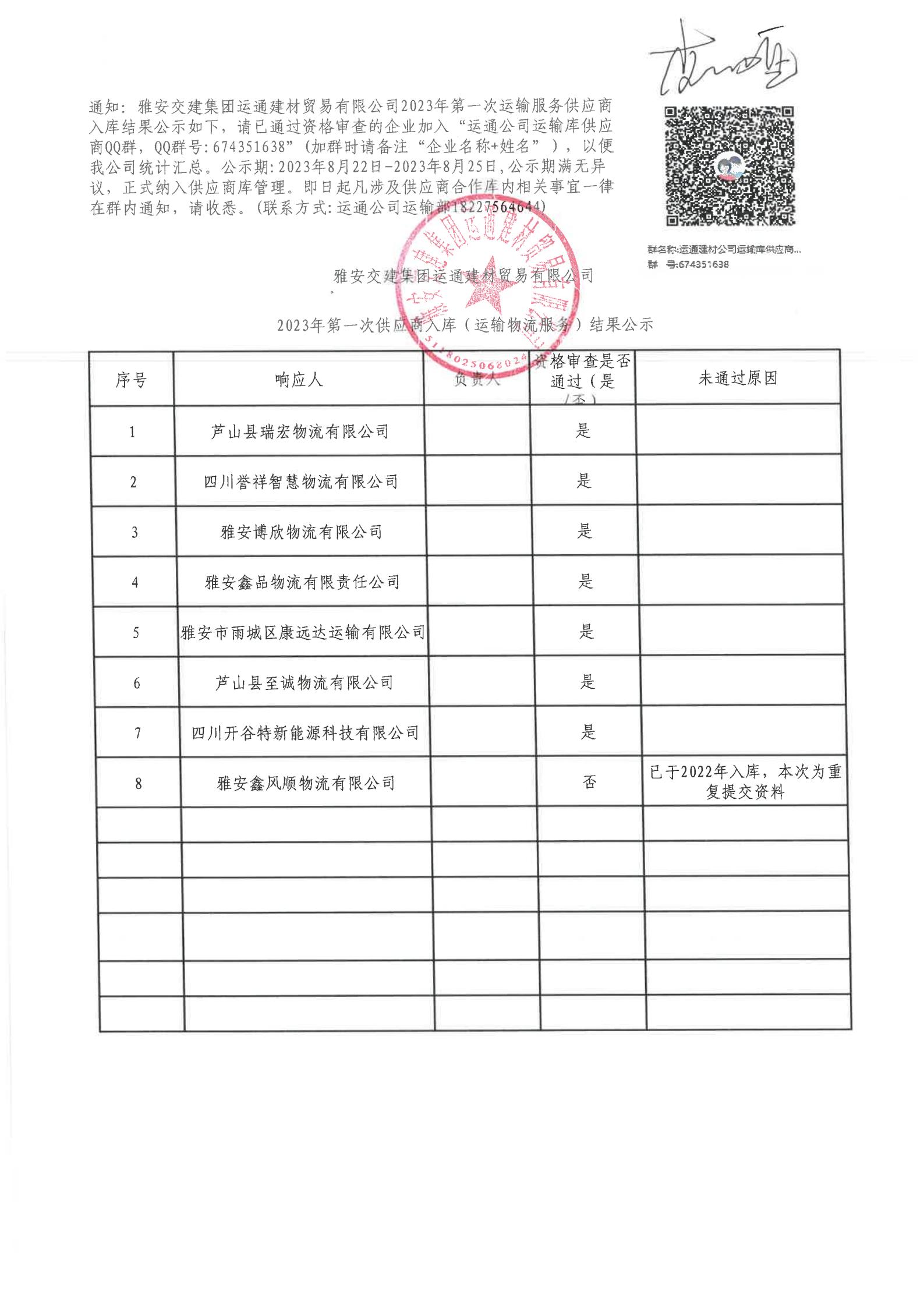 雅安交建集團運通建材貿易有限公司2023年第一次供應商入庫(運輸物流服務)結果公示