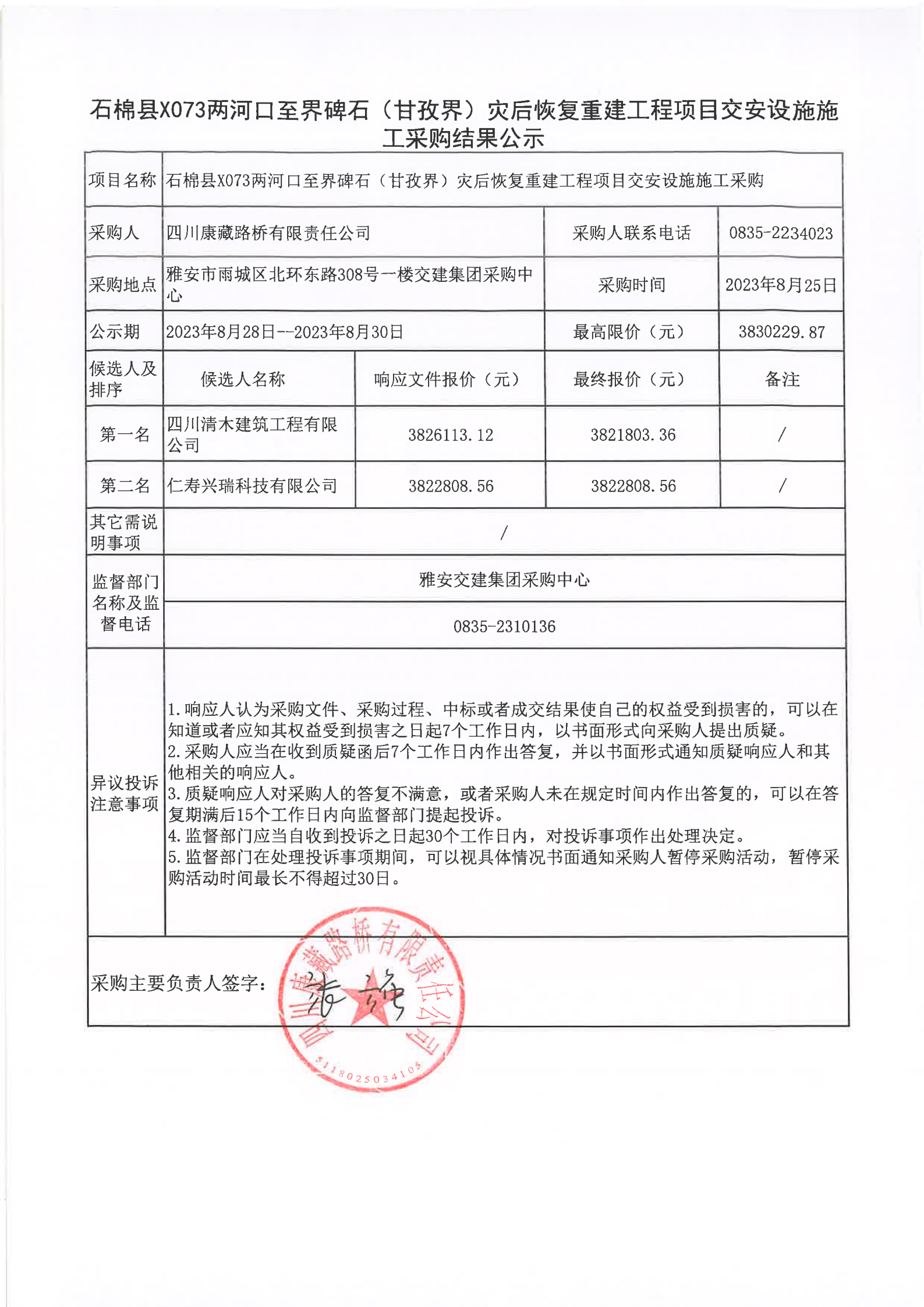 四川康藏路橋有限責(zé)任公司石棉縣X073兩河口至界碑石(甘孜界)災(zāi)后恢復(fù)重建工程項(xiàng)目交安設(shè)施施工采購結(jié)果公示