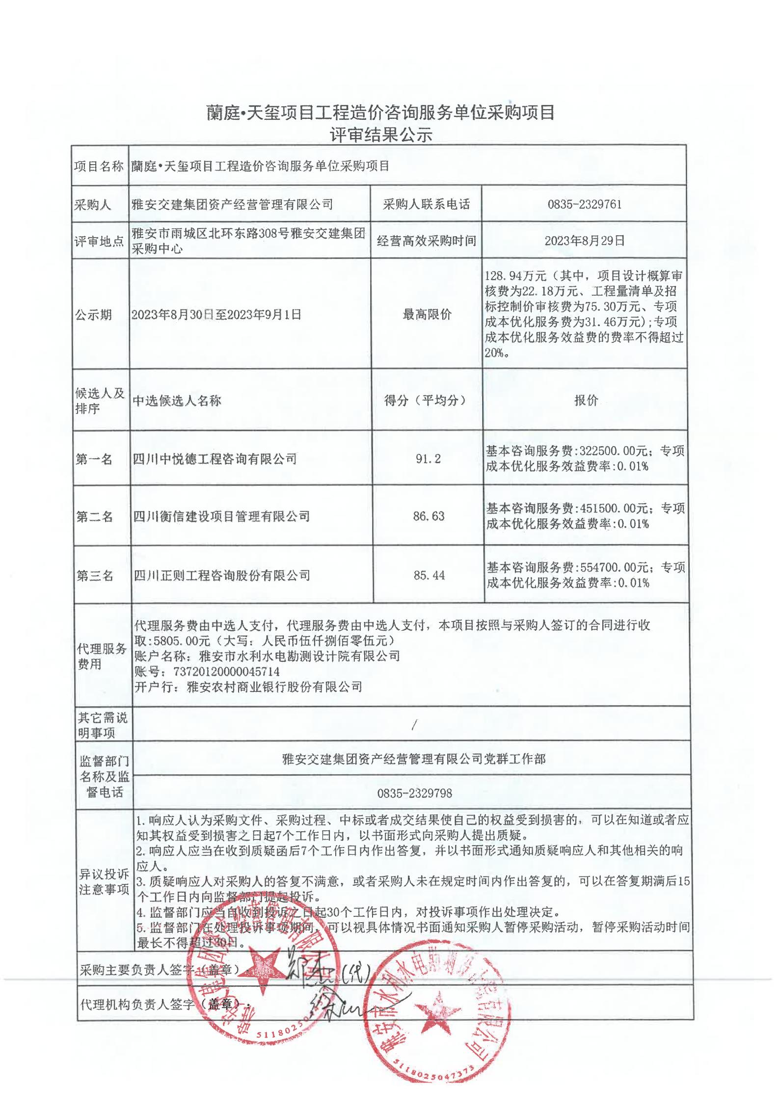 雅安交建集團資產(chǎn)經(jīng)營管理有限公司蘭庭·天璽項目工程造價咨詢服務單位采購項目評審結果公示