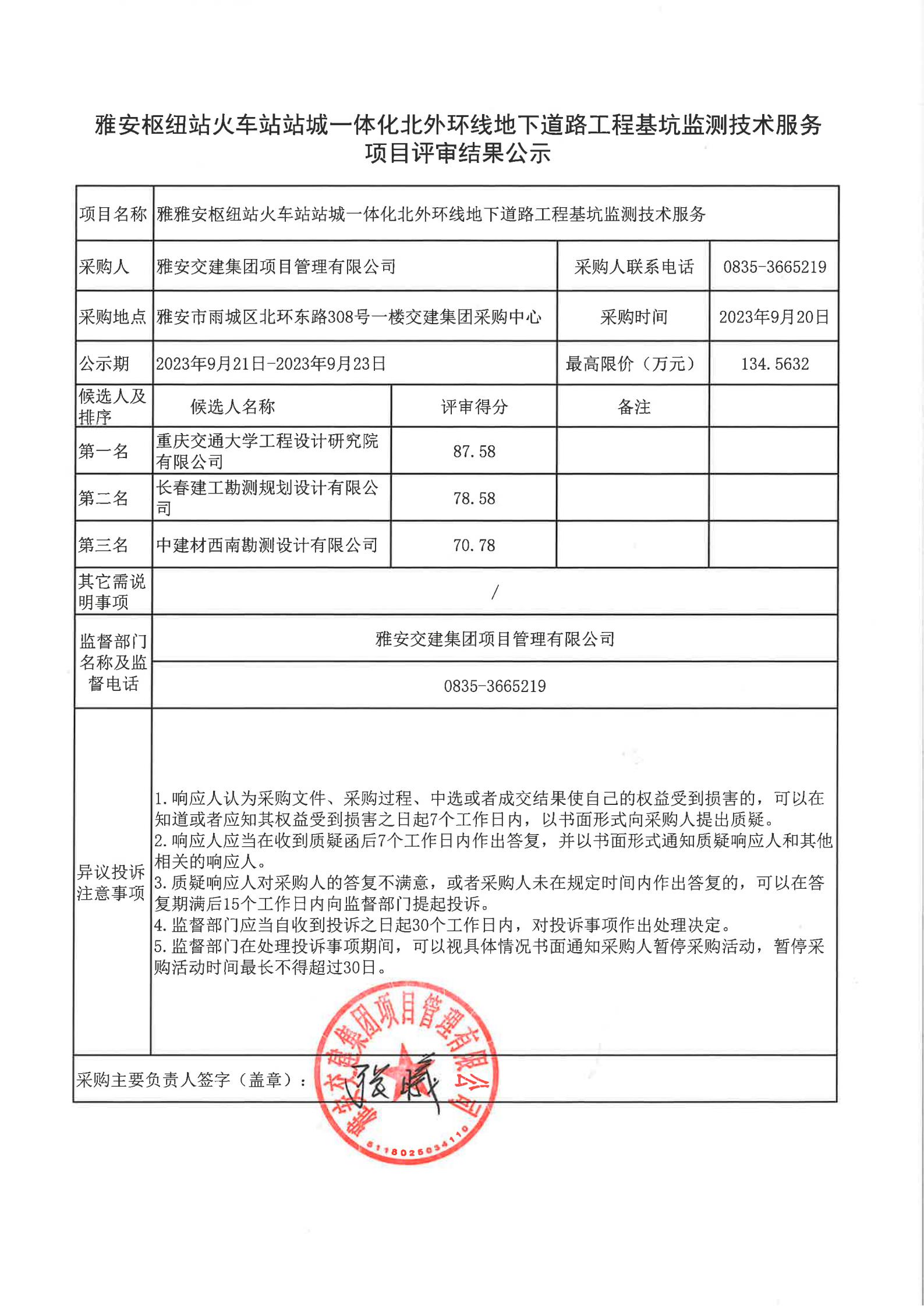 雅安交建集團項目管理有限公司雅安樞紐站火車站站城一體化北外環(huán)線地下道路工程基坑監(jiān)測技術服務項目評審結果公示