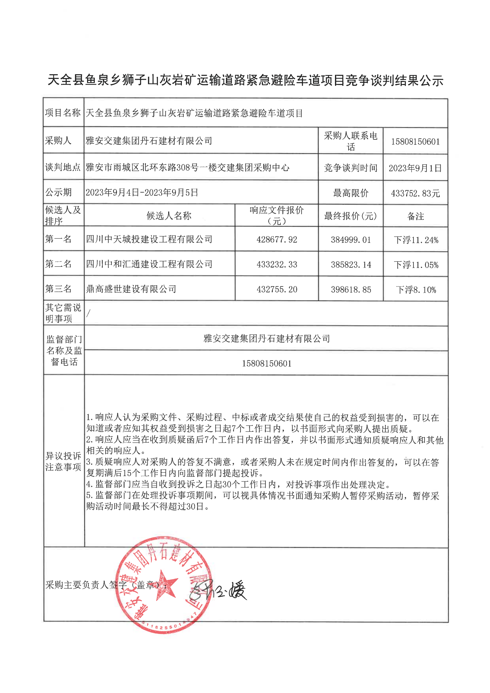 雅安交建集團(tuán)丹石建材有限公司天全縣魚(yú)泉鄉(xiāng)獅子山灰?guī)r礦運(yùn)輸?shù)缆肪o急避險(xiǎn)車道項(xiàng)目競(jìng)爭(zhēng)談判結(jié)果公示
