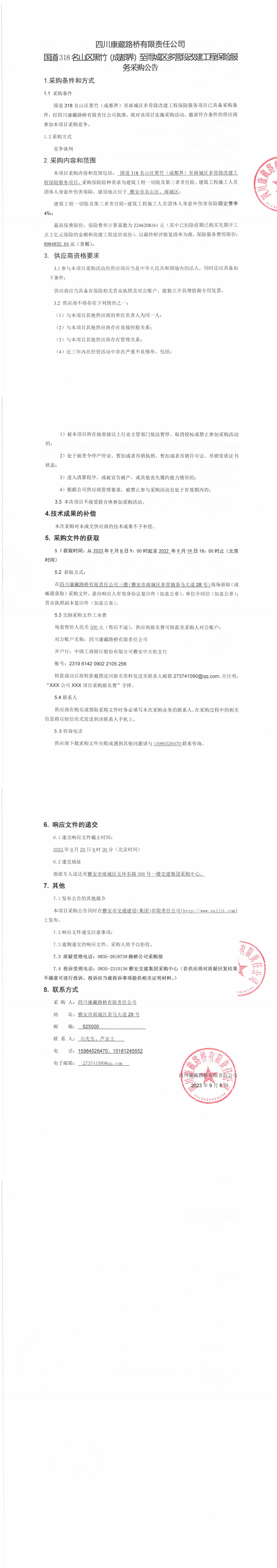 四川康藏路橋有限責任公司國道318名山區(qū)黑竹(成都界)至雨城區(qū)多營段改建工程保險服務(wù)采購公告