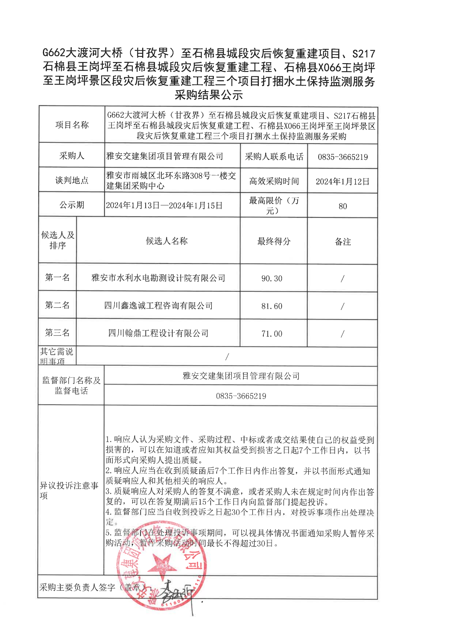 雅安交建集團(tuán)項目管理有限公司G662大渡河大橋(甘孜界)至石棉縣城段災(zāi)后恢復(fù)重建項目、S217石棉縣王崗坪至石棉縣城段災(zāi)后恢復(fù)重建工程、石棉縣X066王崗坪至王崗坪景區(qū)段災(zāi)后恢復(fù)重建工程三個項目打捆水土保持監(jiān)測服務(wù)采購結(jié)果公示